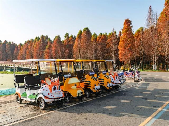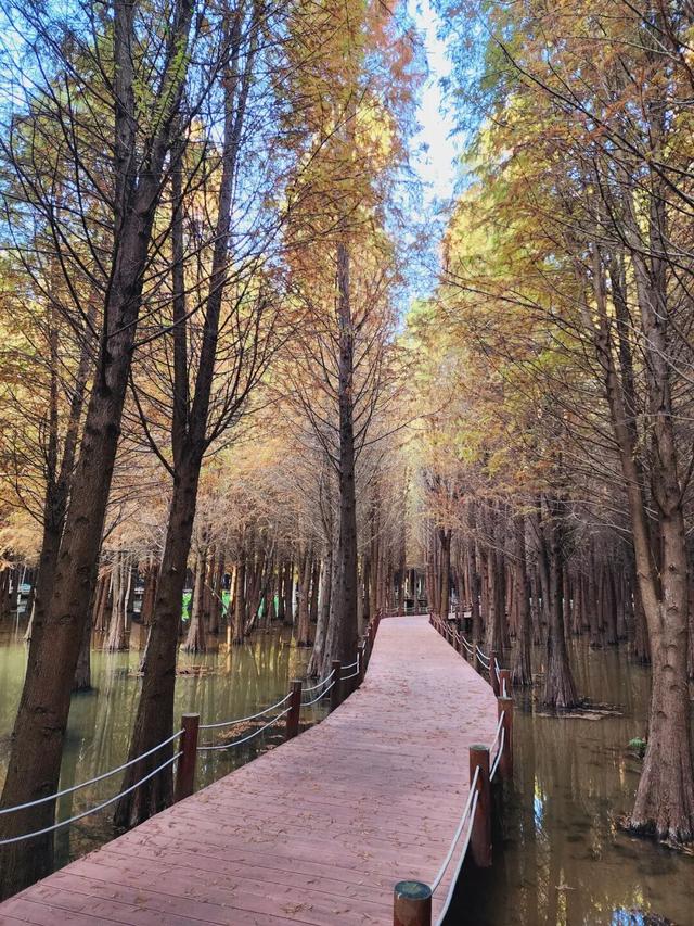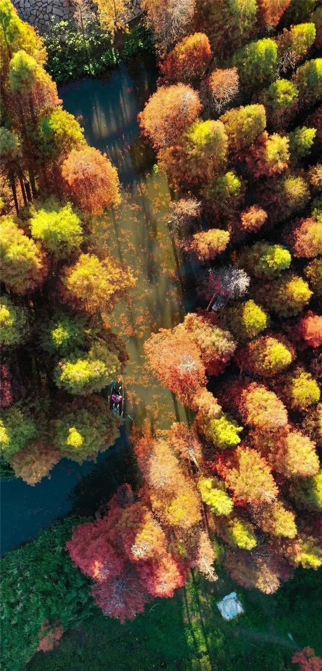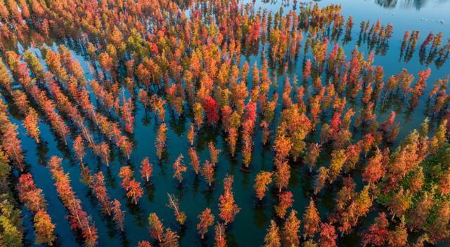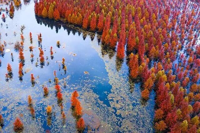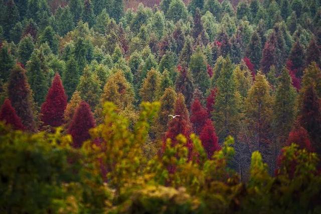 一片片水杉林悄然将橙黄换作红裳