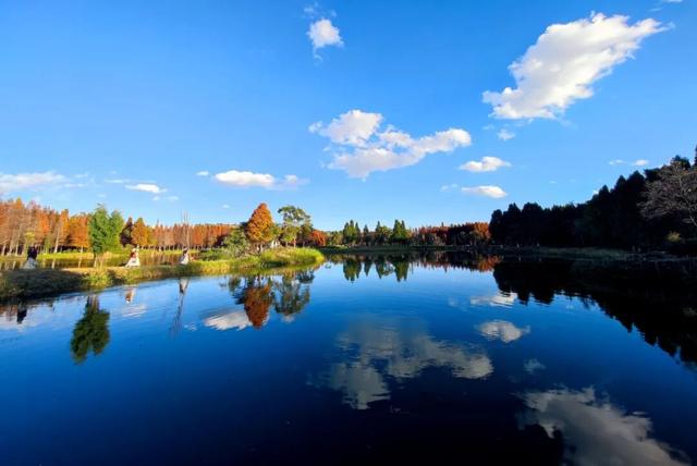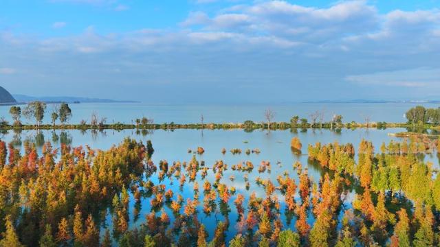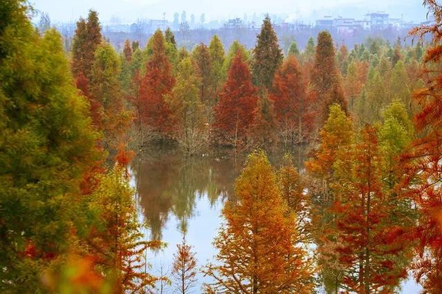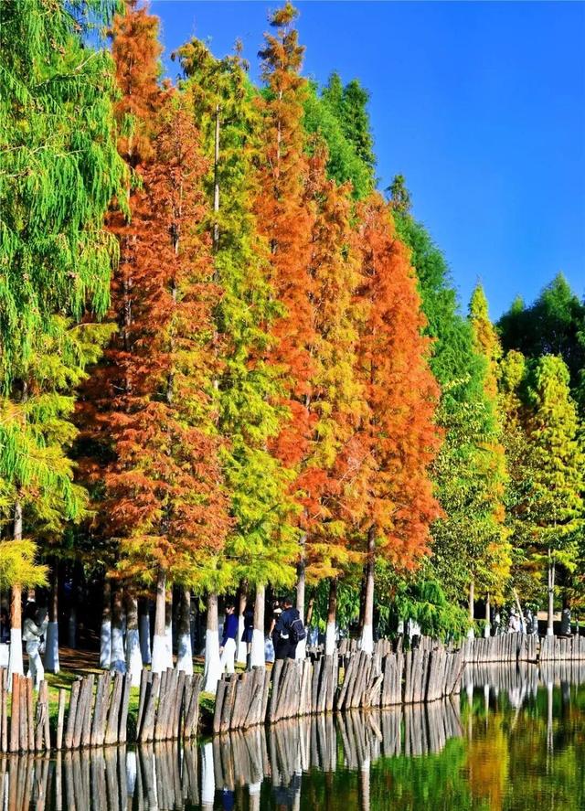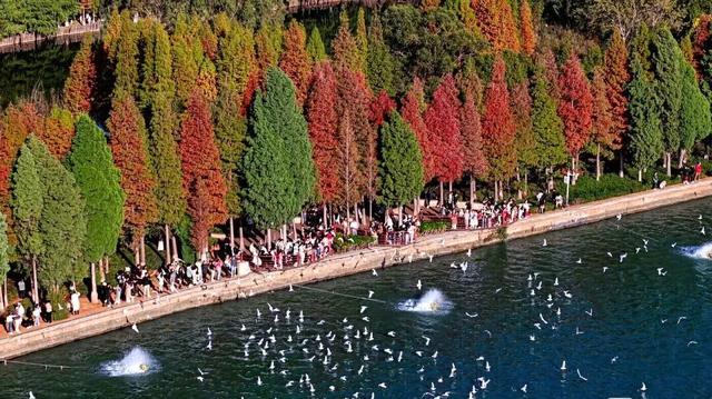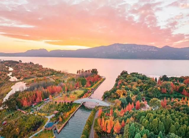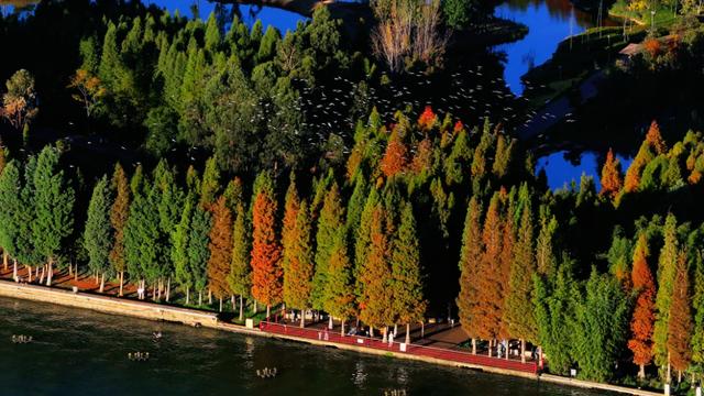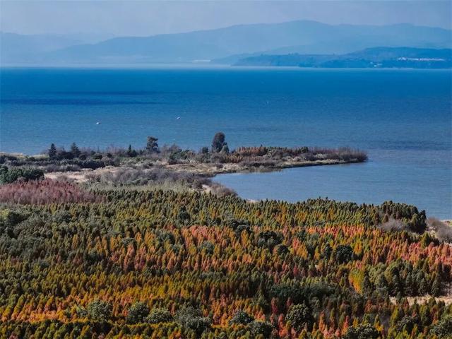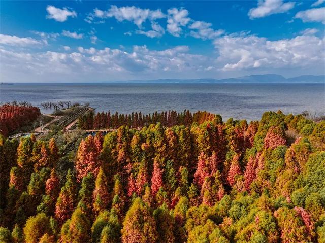 橙红的水杉林与碧蓝的滇池相映