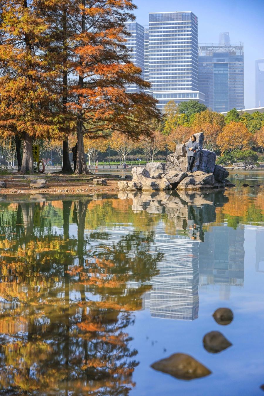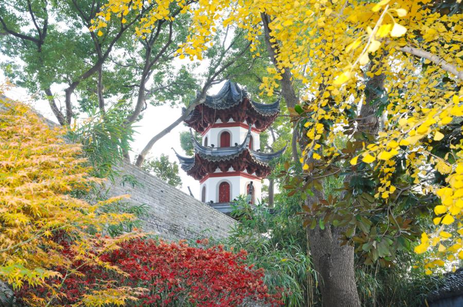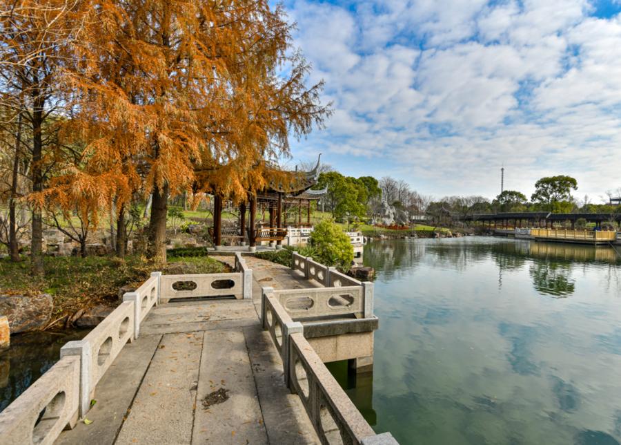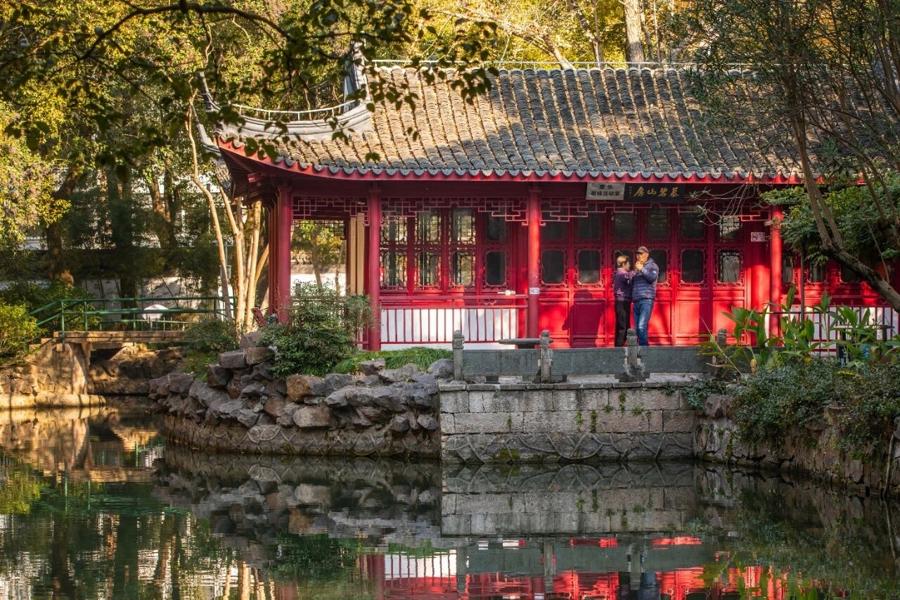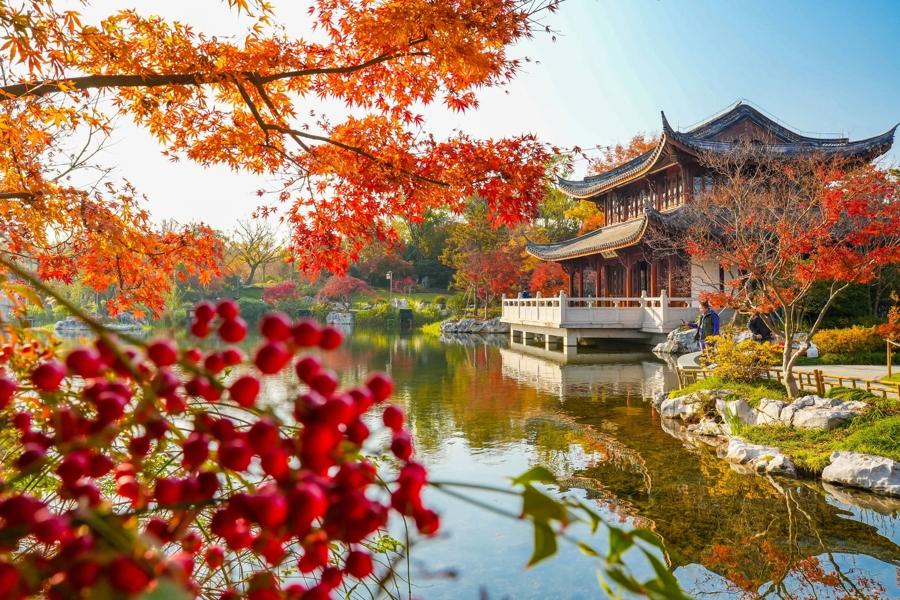 枫叶染霜、乌桕添红,金黄的落叶铺在青石小径上,与园中的亭台水景相映成趣。