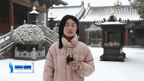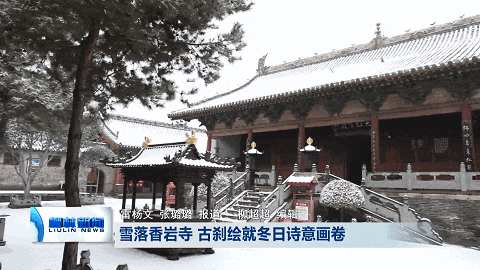观众朋友,我现在是在位于我县香岩寺,昨夜的一场大雪过后,古寺银装素裹,静谧如画。朱墙白雪、青松凝霜,让我们一起走进这冬日的诗意画卷,感受雪中古刹的独特韵味。】