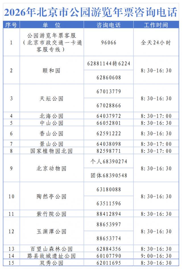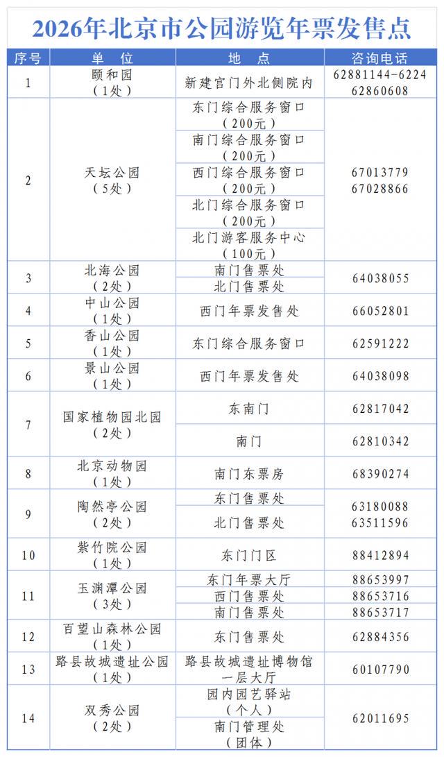 据悉,北京市公园游览年票(100元)适用颐和园、天坛公园、北海公园、中山公园、香山公园、景山公园、国家植物园北园、北京动物园、陶然亭公园、玉渊潭公园、百望山森林公园、双秀公园、北京国际雕塑公园、大观园、地坛公园、水立方。