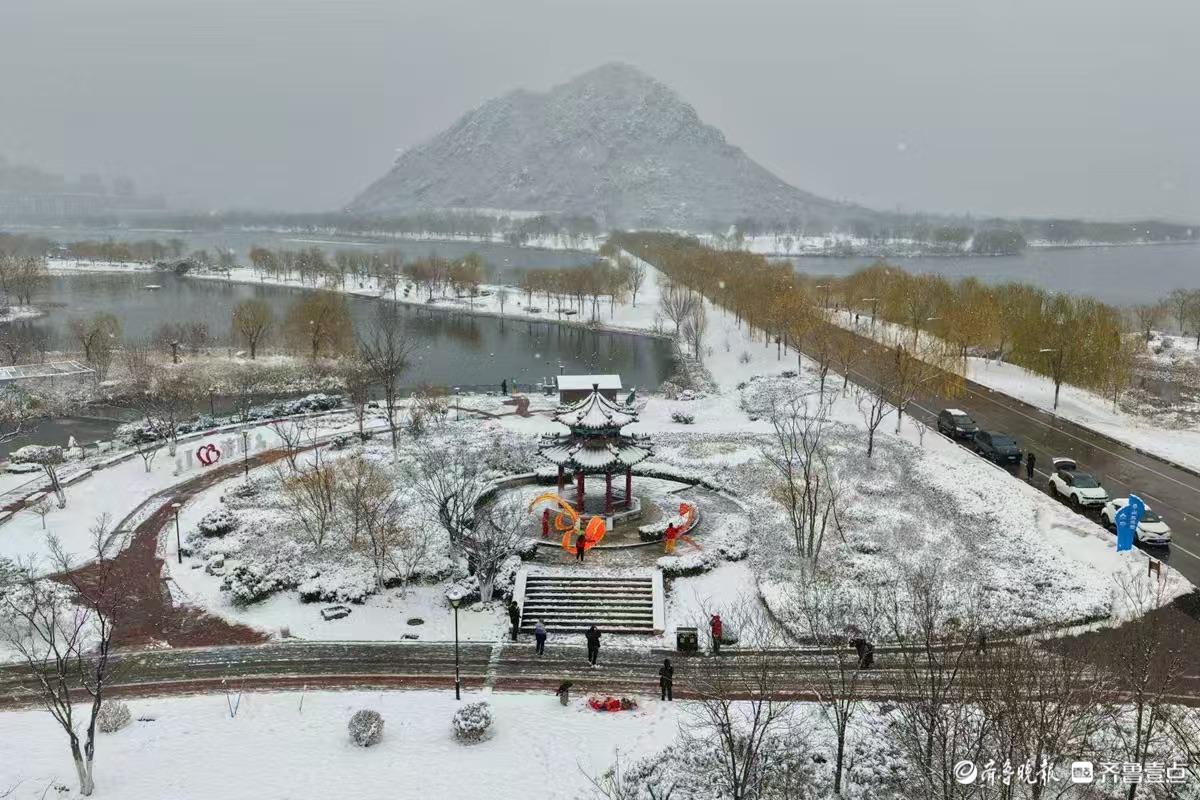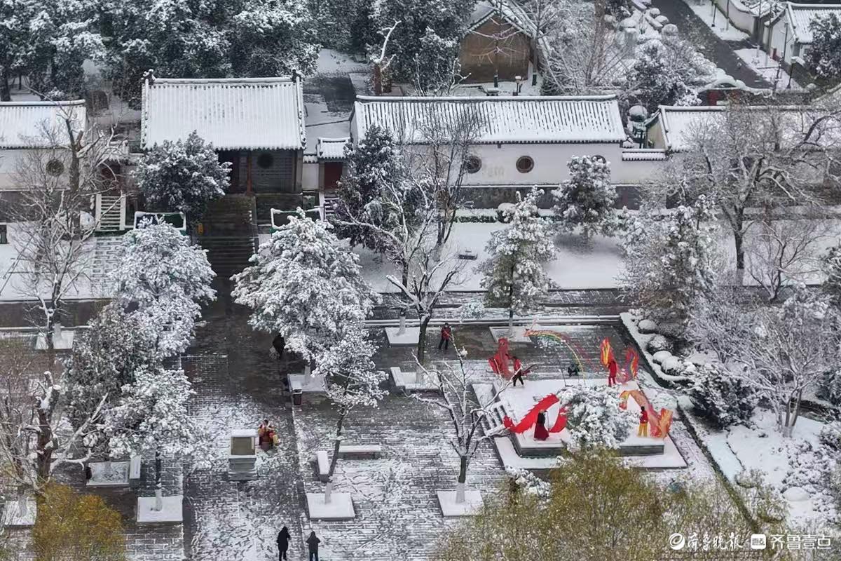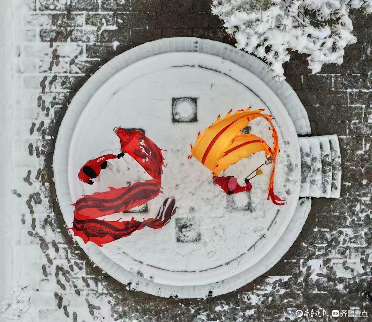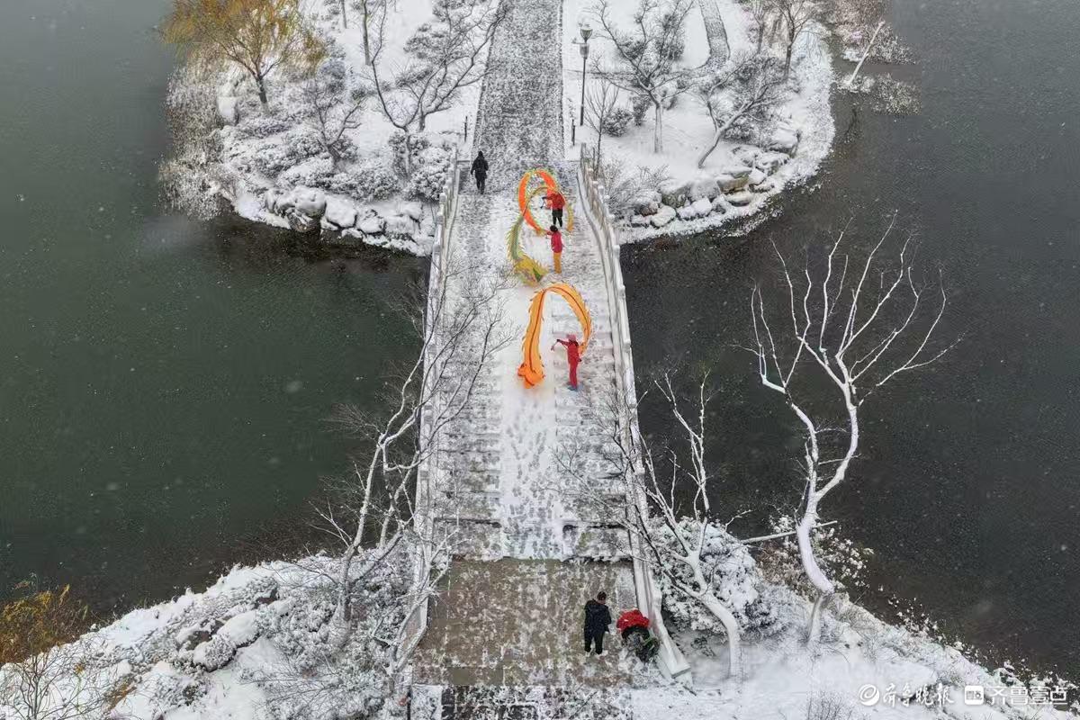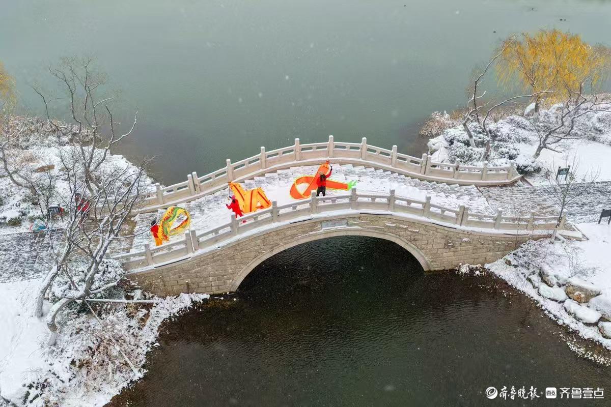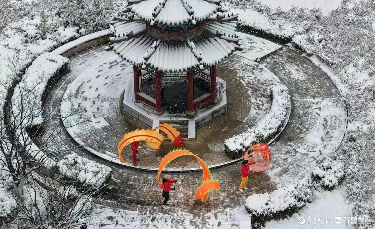 12月12日,济南迎来了今冬第一场大雪。华山景区一片银装素裹,黛色山影在薄雾中朦胧,枝头的雪絮簌簌,勾勒出清冷的冬日画卷。 而这片素白里,却燃着跃动的红。健身龙爱好者们踏雪而来,红金相间的龙绸在他们手中翻飞,或绕成圆虹,或甩作长练,雪沫被龙绸带起的风卷动,与飘带缠作一团。舞者的身影在亭台石桥间辗转,呵出的白气混着龙绸的红,让清冷的华山雪景,多了满溢的生机与人间暖意。 王平 摄