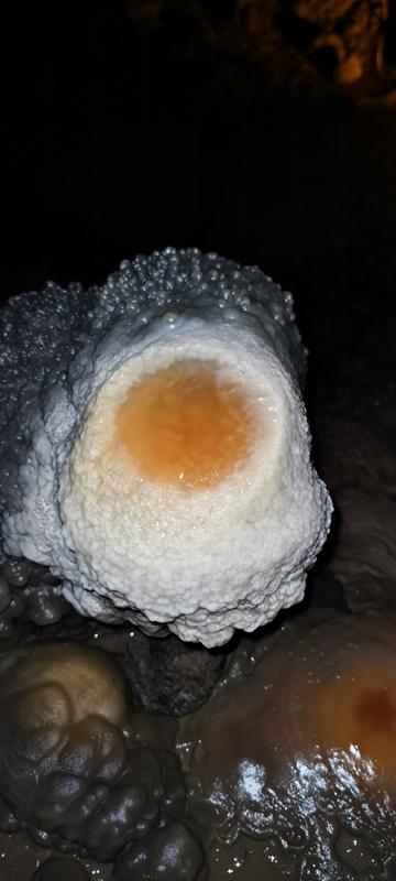 专家组直奔溶洞深处的“荷包蛋”景点。“荷包蛋”,顾名思义,就是形如一个鲜嫩的荷包蛋的钟乳石。融媒体访谈组开门见山提问钟乳石的成因。省地质调查院旅游地质研究所所长陈明华专家娓娓道来:“钟乳石的成分是碳酸钙。它从我们头顶的石缝中滴下来的,因为我们头顶上这种石头俗称石灰岩,也就是以前农村烧石灰用的那种岩石,地质学称之‘灰岩’,其成分为碳酸钙……水、二氧化碳侵入岩石,碳酸钙就渐渐融解,形成碳酸氢钙溶液,顺着岩石的裂隙一滴滴地滴下来,含有碳酸氢钙的溶液,在特殊的情况下,分解成碳酸钙、二氧化碳和水,所以我们看到的钟乳石就是凝固下来的碳酸钙。”关于钟乳石为何呈现不同色彩,陈专家指着“荷包蛋”解说道:“我们面前这块钟乳石,就像溏心的荷包蛋一样。因为‘蛋’里面的碳酸钙不纯,含有其他杂质,比如硫、铁等,就会呈现不同的颜色。‘蛋’外面白色透明,就是因为其中的碳酸钙是纯净的。”