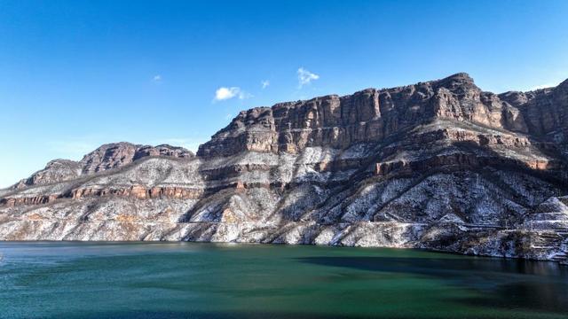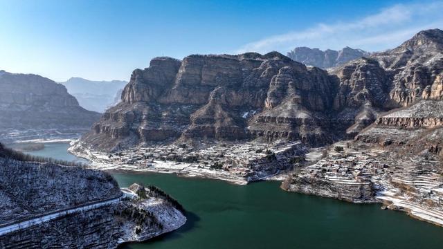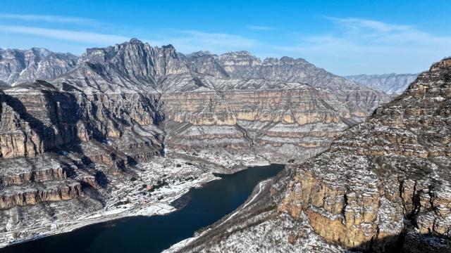 受冷空气影响,12月12日,河南安阳市林州太行大峡谷迎来今冬初雪。次日天晴,暖阳遍洒,太行大峡谷银装素裹,分外妖娆。放眼望去,白雪覆盖峰峦,红色石英砂岩与素雪相映,勾勒出雄浑轮廓;山间道路积雪铺就,沿线村落炊烟袅袅,石板房脊顶雪层如棉。澄澈湖水如翡翠流转,湖岸冰雪晶莹,碧水与雪山交相辉映;岸边林木凝霜挂雪,玉树琼枝间,山、雪、水、村相融一体,绘就一幅静谧雄奇的冬日画卷,美不胜收。