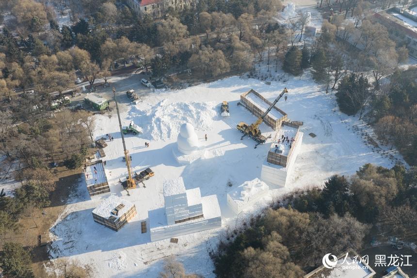 人民网哈尔滨12月16日电 近日,第三十八届太阳岛雪博会园区建设正有序推进。
