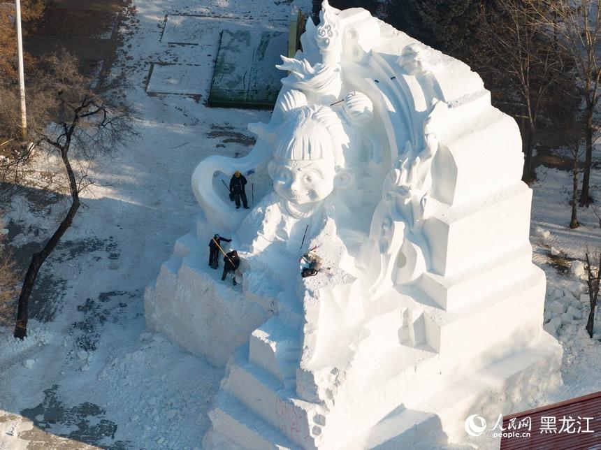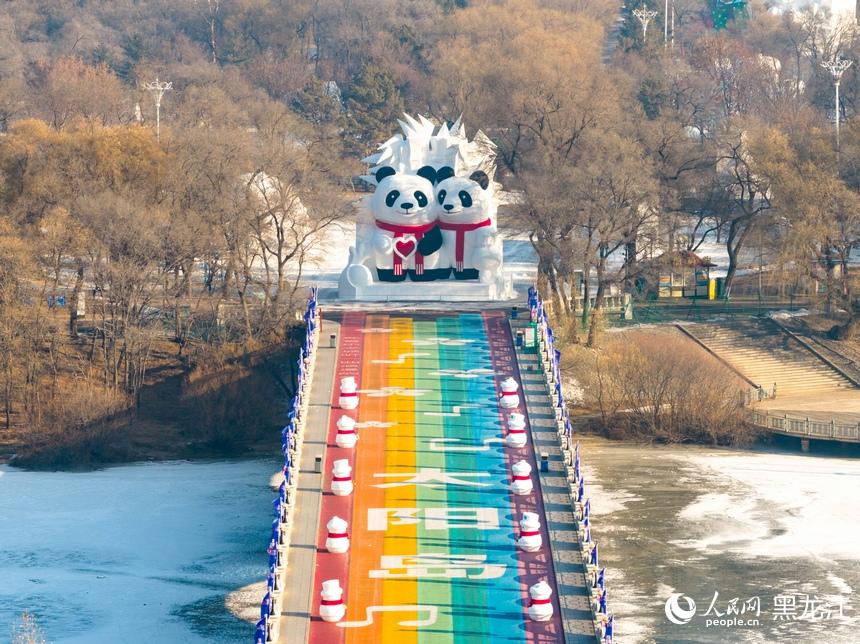 高23.8米的标志性景观“雪人先生”已全面建成,憨态可掬的模样吸引不少市民游客驻足合影;结对亮相的熊猫造型雪雕搭配彩虹步道,将氛围感拉满;哪吒主题雪雕正处于精细雕琢阶段,灵动轮廓已初步显现。
