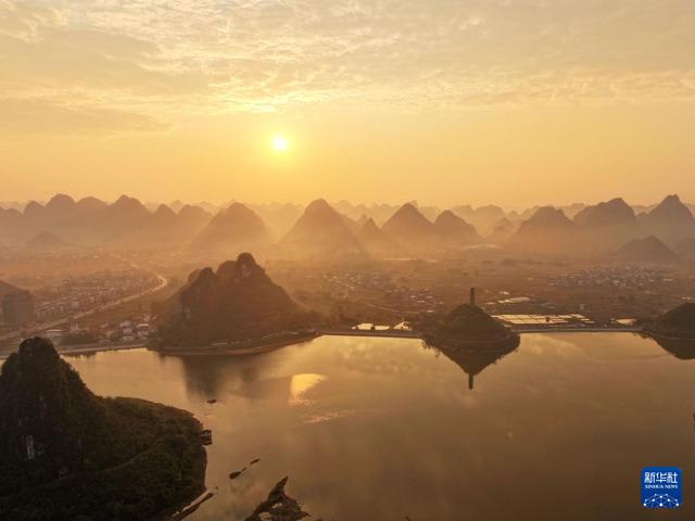 12月17日在广西河池市罗城仫佬族自治县成龙湖公园拍摄的晨景(无人机照片)。