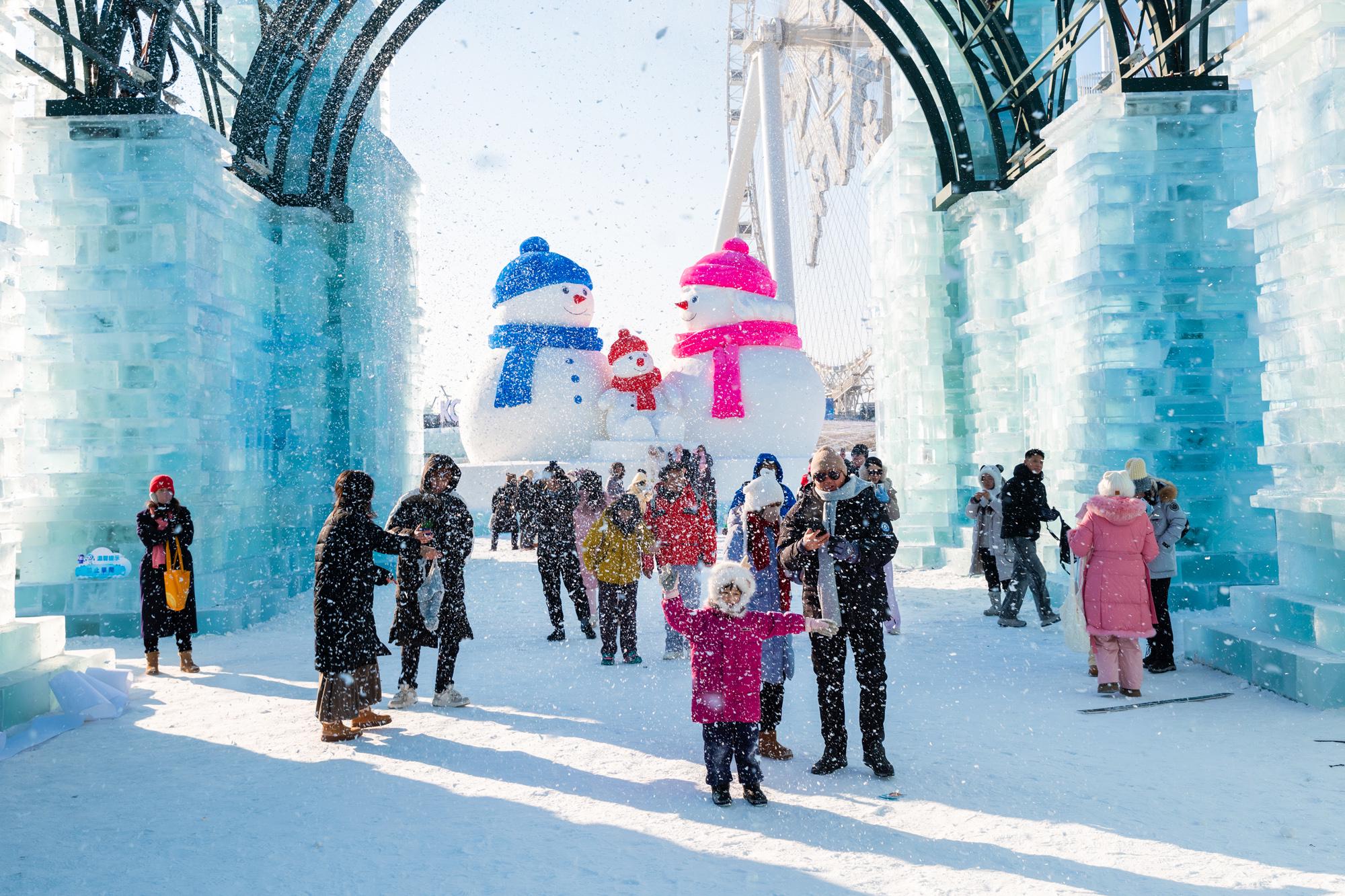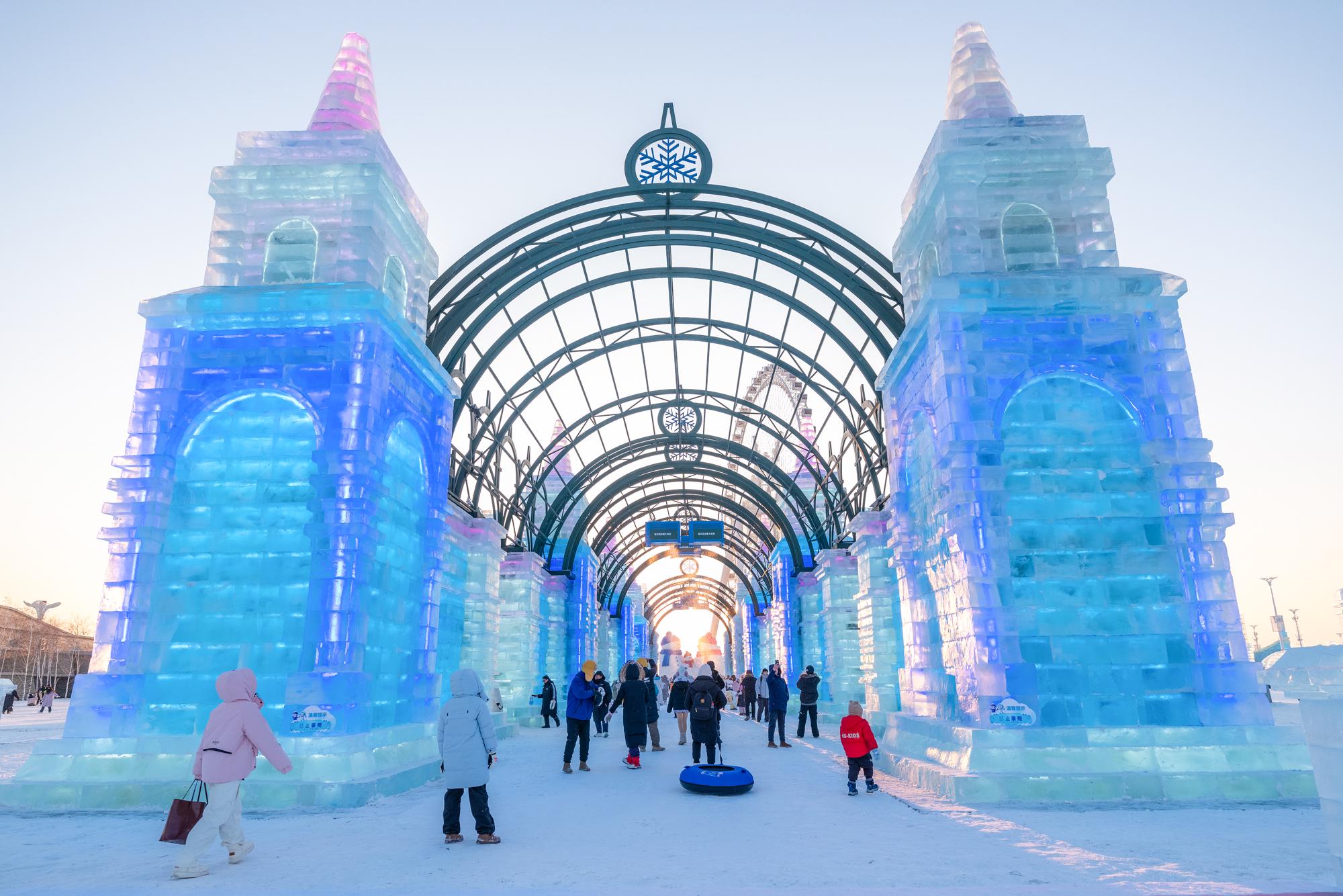 ↑2025年12月17日,游客在黑龙江哈尔滨冰雪大世界园区内游玩。CICPHOTO/耿洪杰 摄