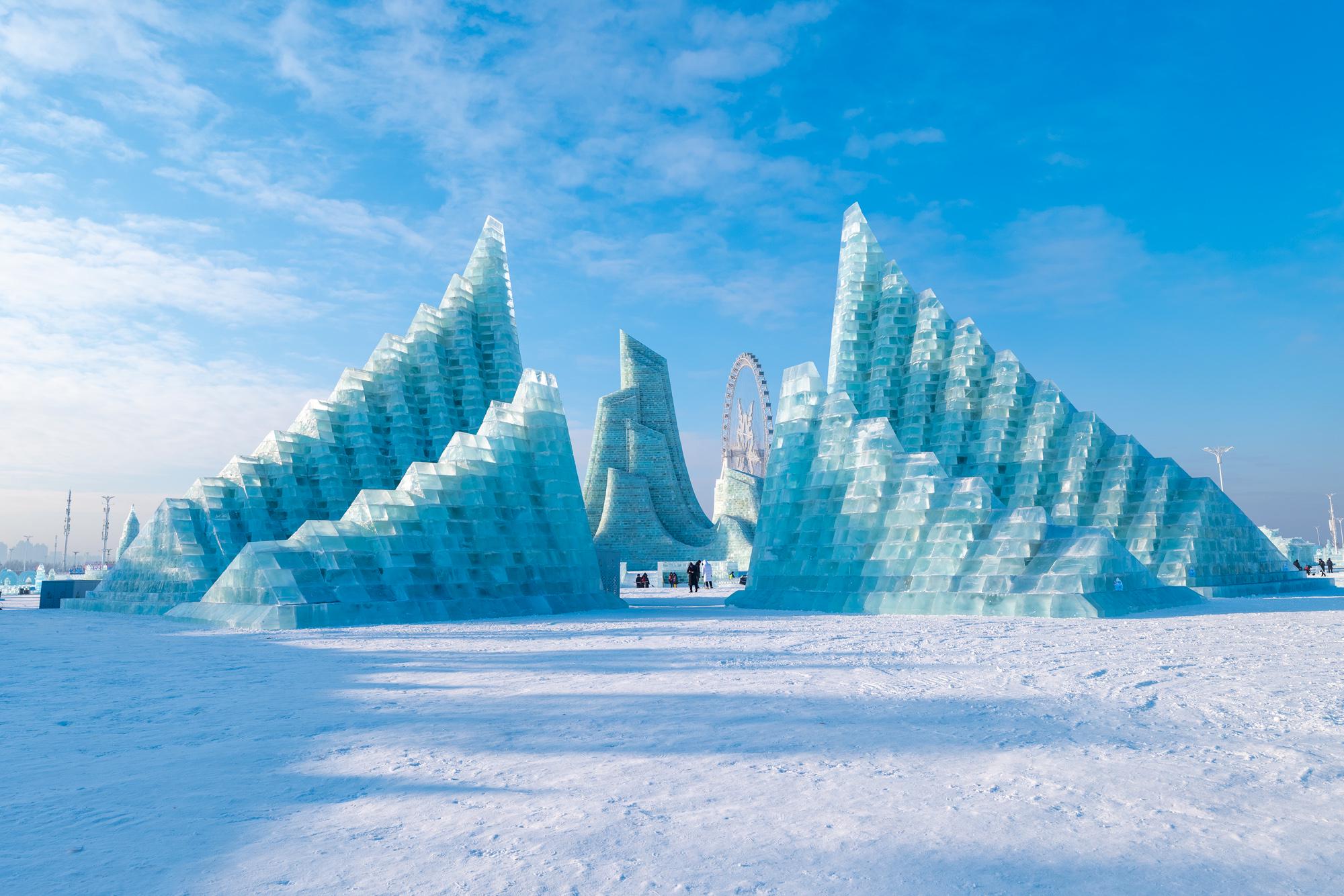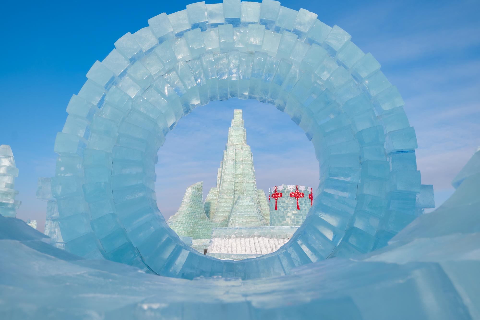 ↑2025年12月17日在黑龙江哈尔滨冰雪大世界园区内拍摄的冰雕。CICPHOTO/耿洪杰 摄