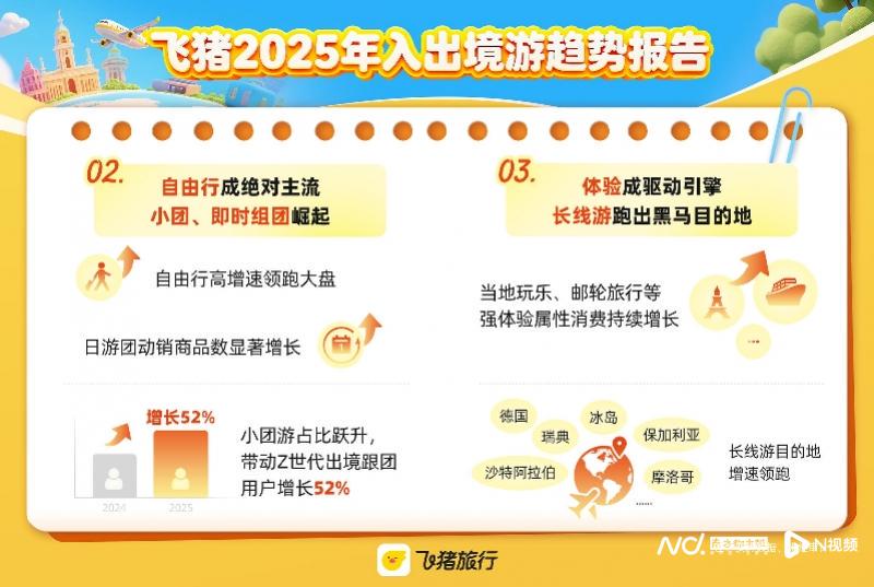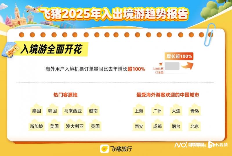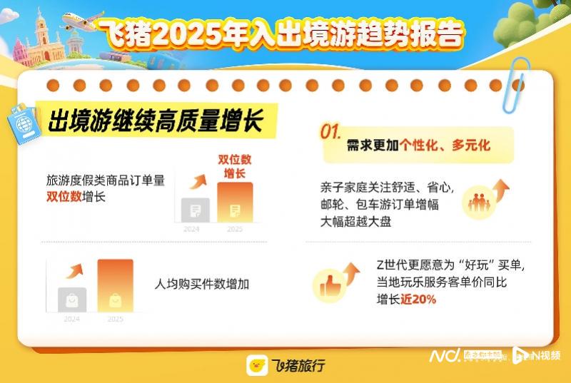 12月18日,飞猪发布的《2025年入出境游趋势报告》显示,2025年出境游继续保持高质量增长,包括线路游、当地玩乐、景区门票、出境邮轮、签证通讯服务等在内的出境旅游度假类商品订单量同比双位数增长,人均购买件数在去年的基础上有所增加;入境游迎来爆发,海外用户入境机票订单量同比增长超1倍,其中以上海为目的地的机票预订增长接近6倍。