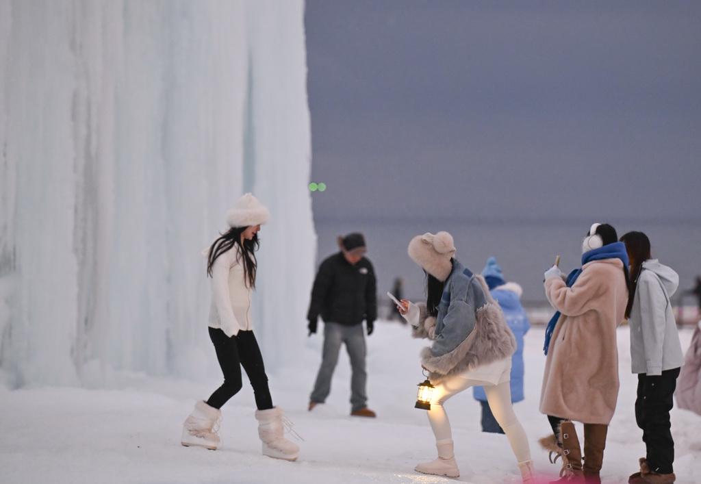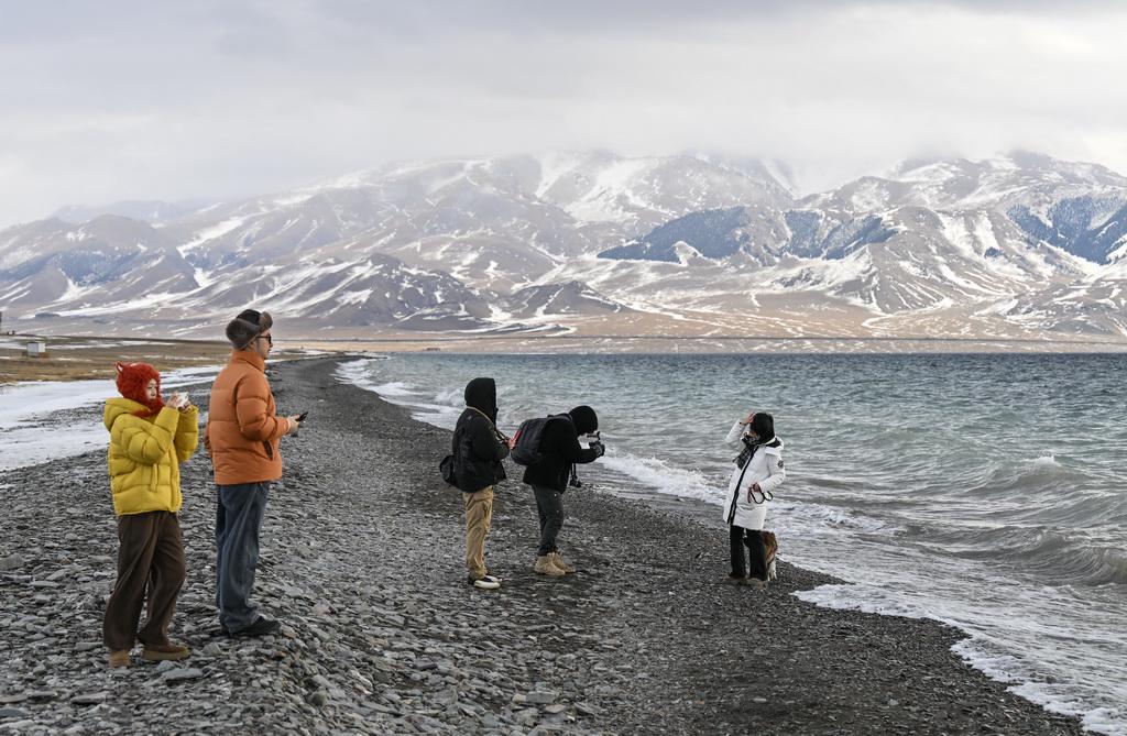 游客在赛里木湖边游玩留影(12月16日摄)。