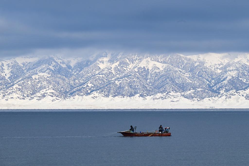 一条小船在赛里木湖中驶过(12月16日摄)。