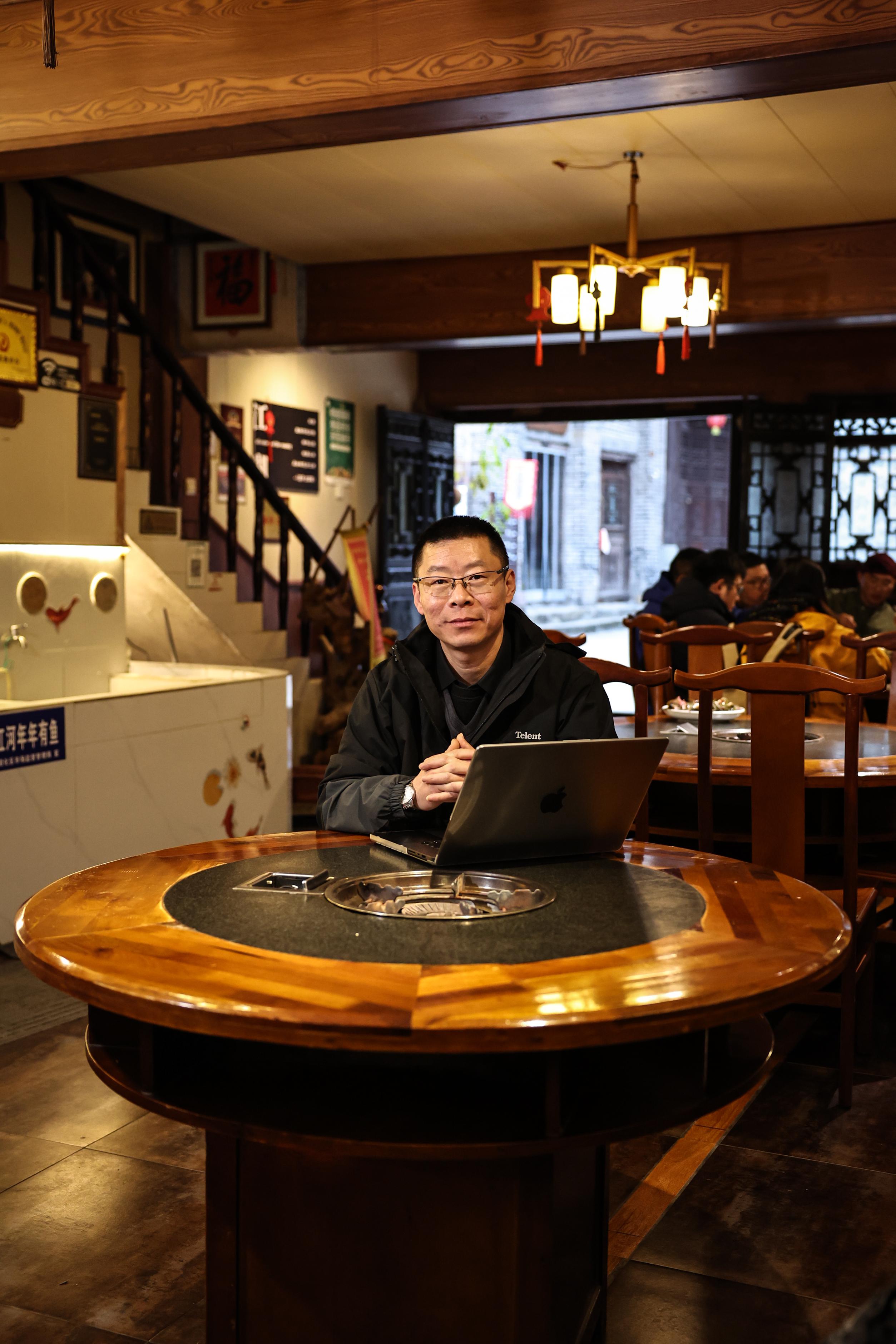 翟志刚在自己经营的餐馆内(2025年12月13日摄)。马上年满50岁的翟志刚除了是经营者,还是蜀道三国文化研究会秘书长,长期致力于昭化古城文化遗产保护与研究工作。