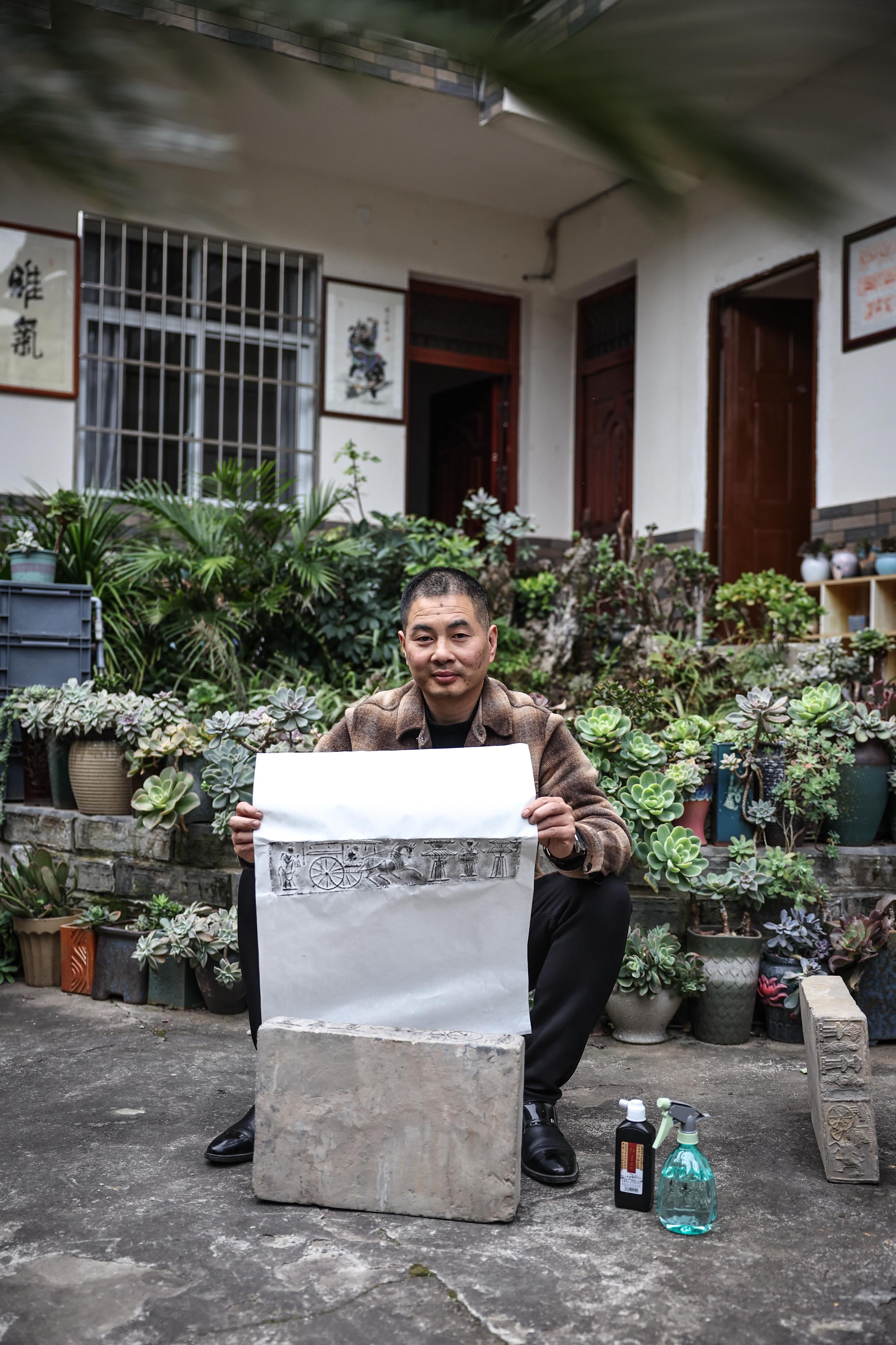 昭化区昭化镇汉砖收藏爱好者饶斌在家中展示汉砖拓印作品(2025年12月13日摄)。饶斌十多岁开始在田边地头收捡残砖,2010年开始大量收藏汉代画像砖。