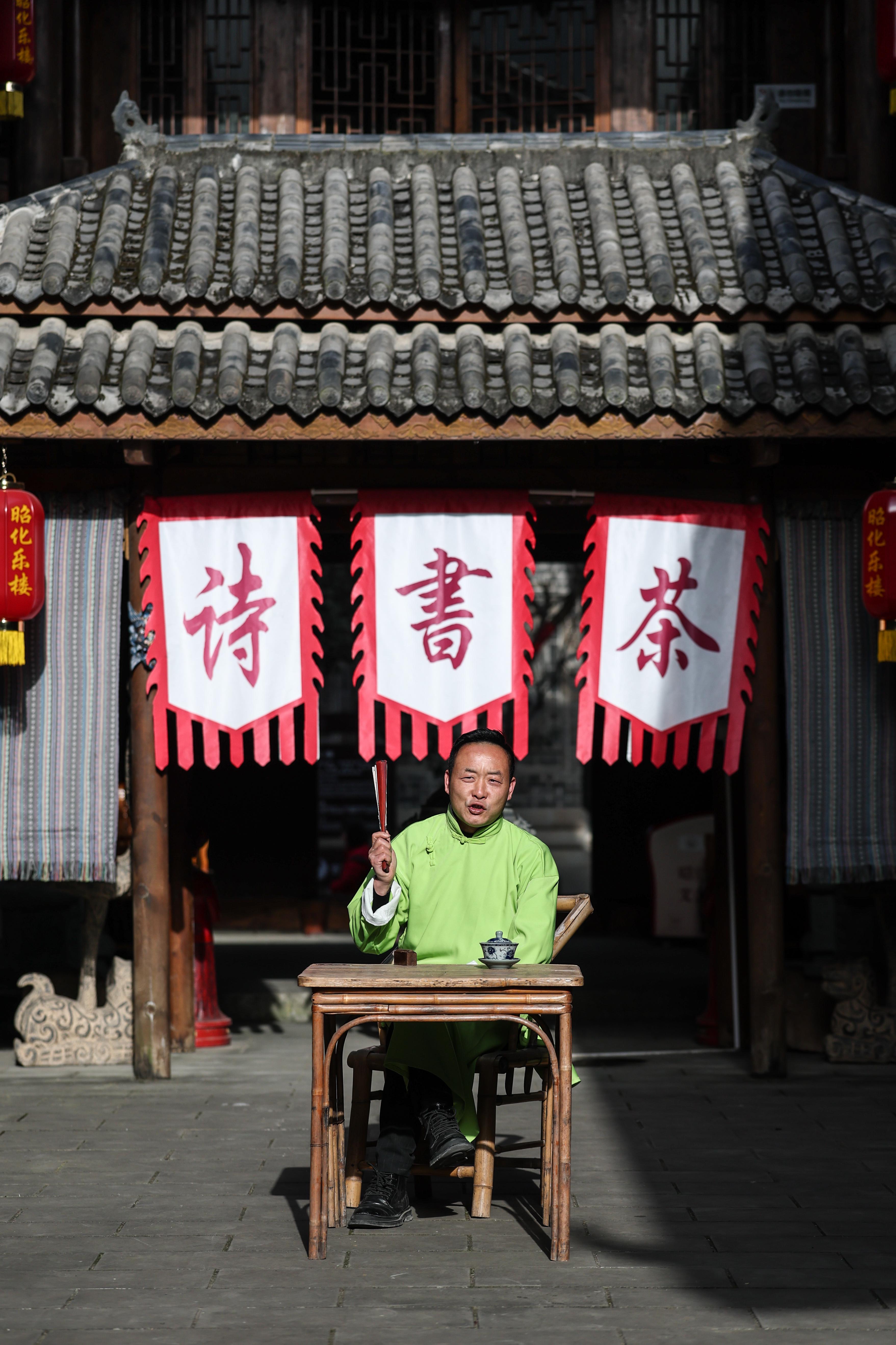 苟欢在表演评书(2025年12月13日摄)。苟欢是四川省非物质文化遗产川北雷棚评书的第五代传承人,长期在昭化评书馆从事评书艺术表演和蜀道文化传承工作。