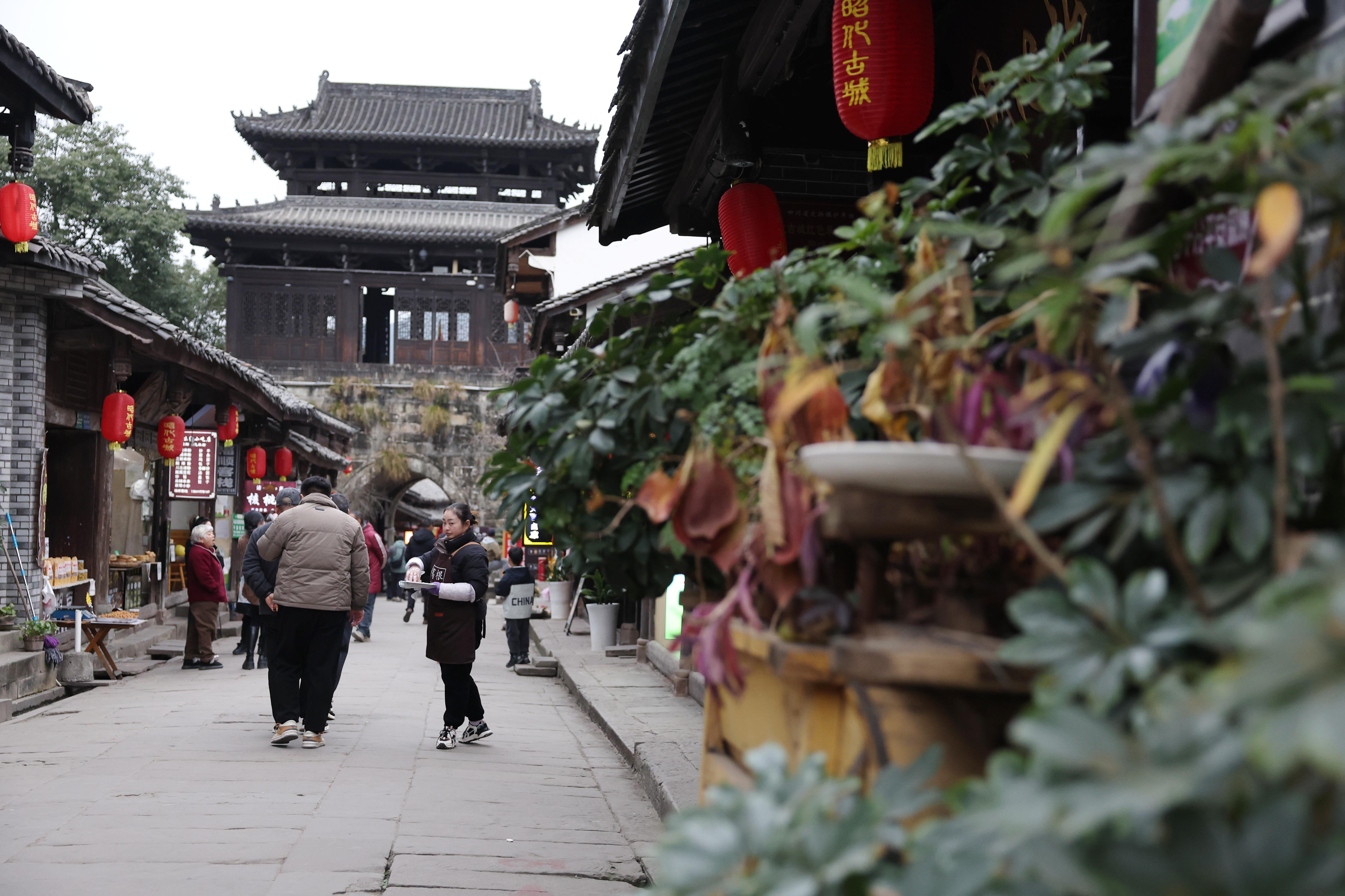 拼版照片:上图为游客在昭化古城观光游览(2025年12月12日摄);右下图为游客在昭化古城观光游览(2025年12月12日摄)。