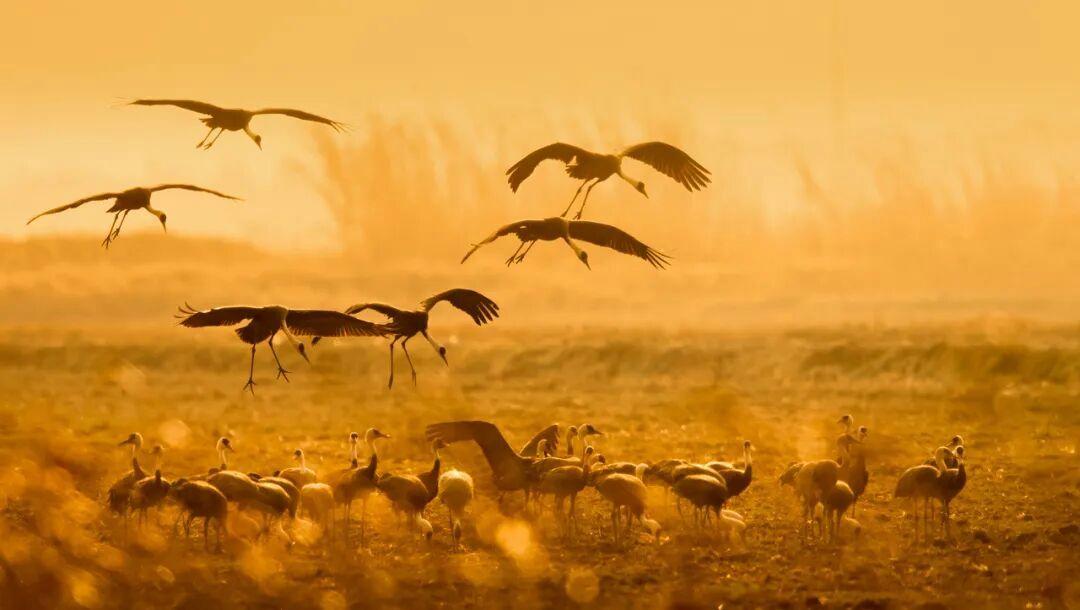 成群的鸟儿或在金黄的芦苇上空翩跹起舞,