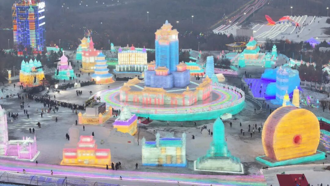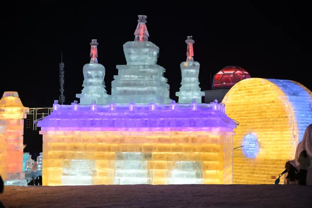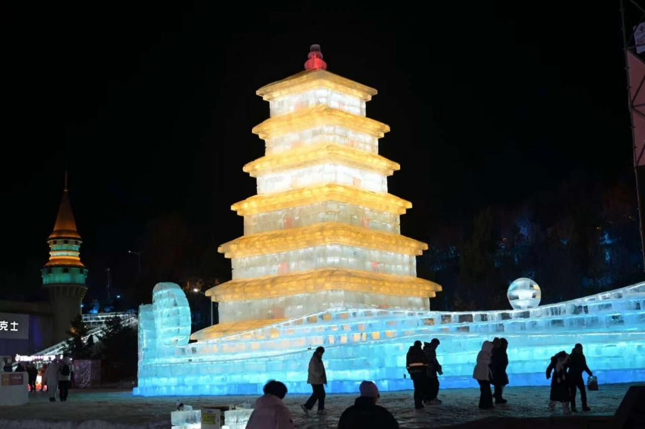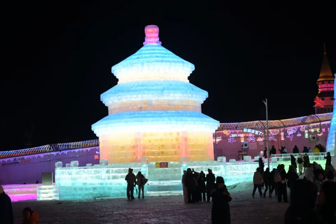 此外,长春冰雪新天地还将全国各地的地标“搬”进了园区里,惟妙惟肖的长春站、西安的大雁塔、北京的天坛、苏州的东方之门等冰雕让游客一园看遍全国美景。