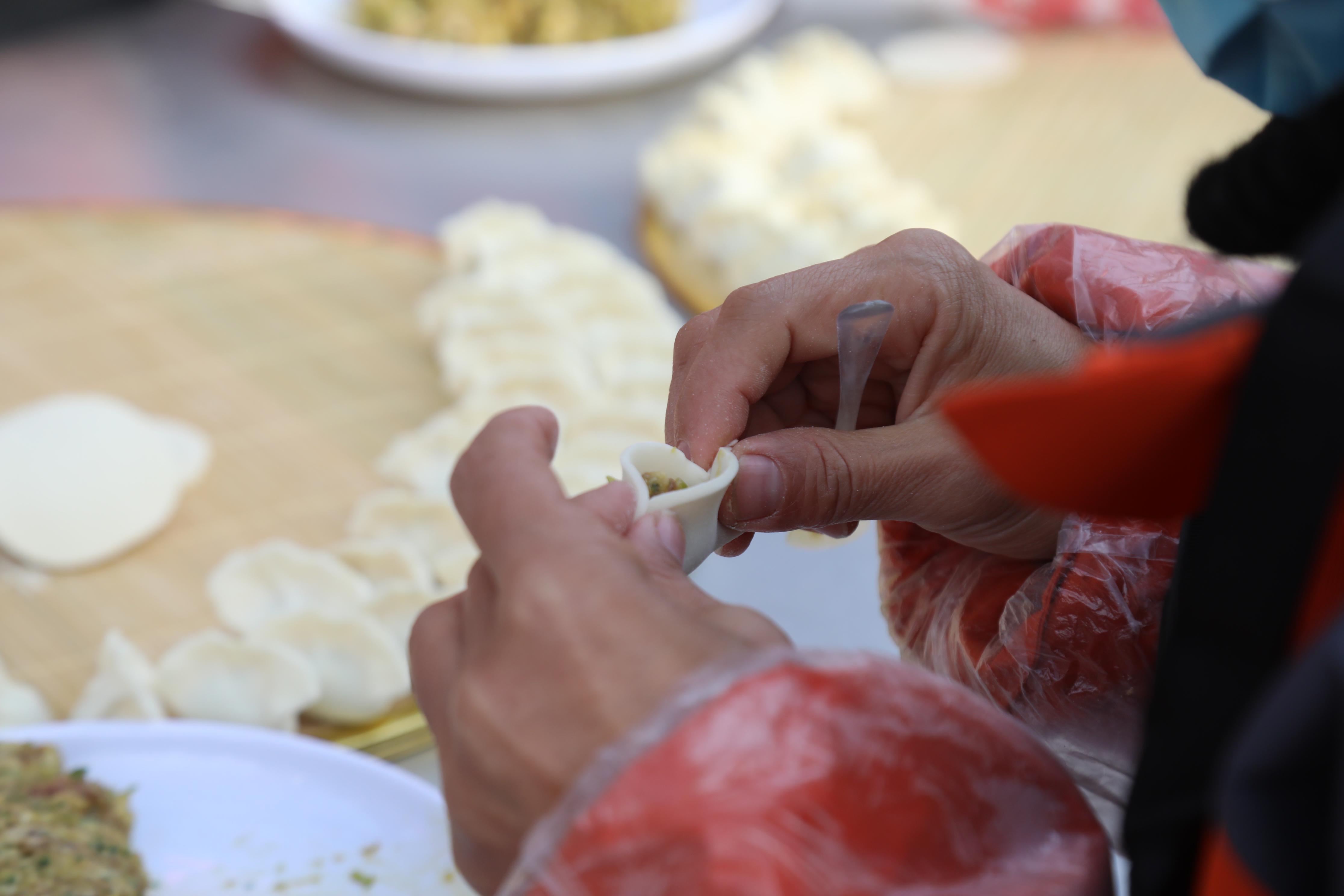 活动现场,最热闹的当属包饺子大赛。揉面、擀皮、包馅,参赛游客们各展身手,手法娴熟、动作麻利,包出的饺子形如月牙、褶子均匀。