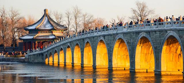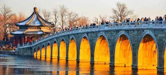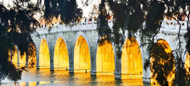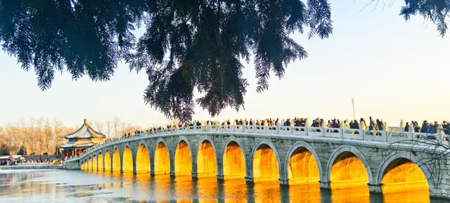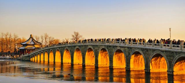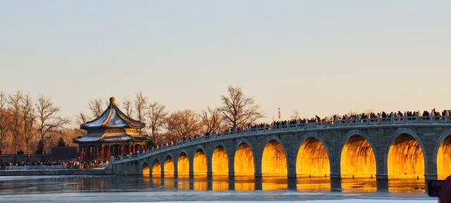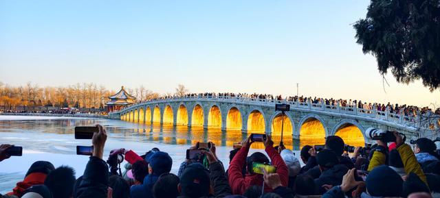 近日,颐和园十七孔桥再现“金光穿洞”景象。位于北京颐和园内昆明湖水域的十七孔桥,因由17个桥洞组成而得名。每年冬至前后,日落时分,这里都会迎来“金光穿洞”景观。愿这份美好带给你喜悦与幸福!