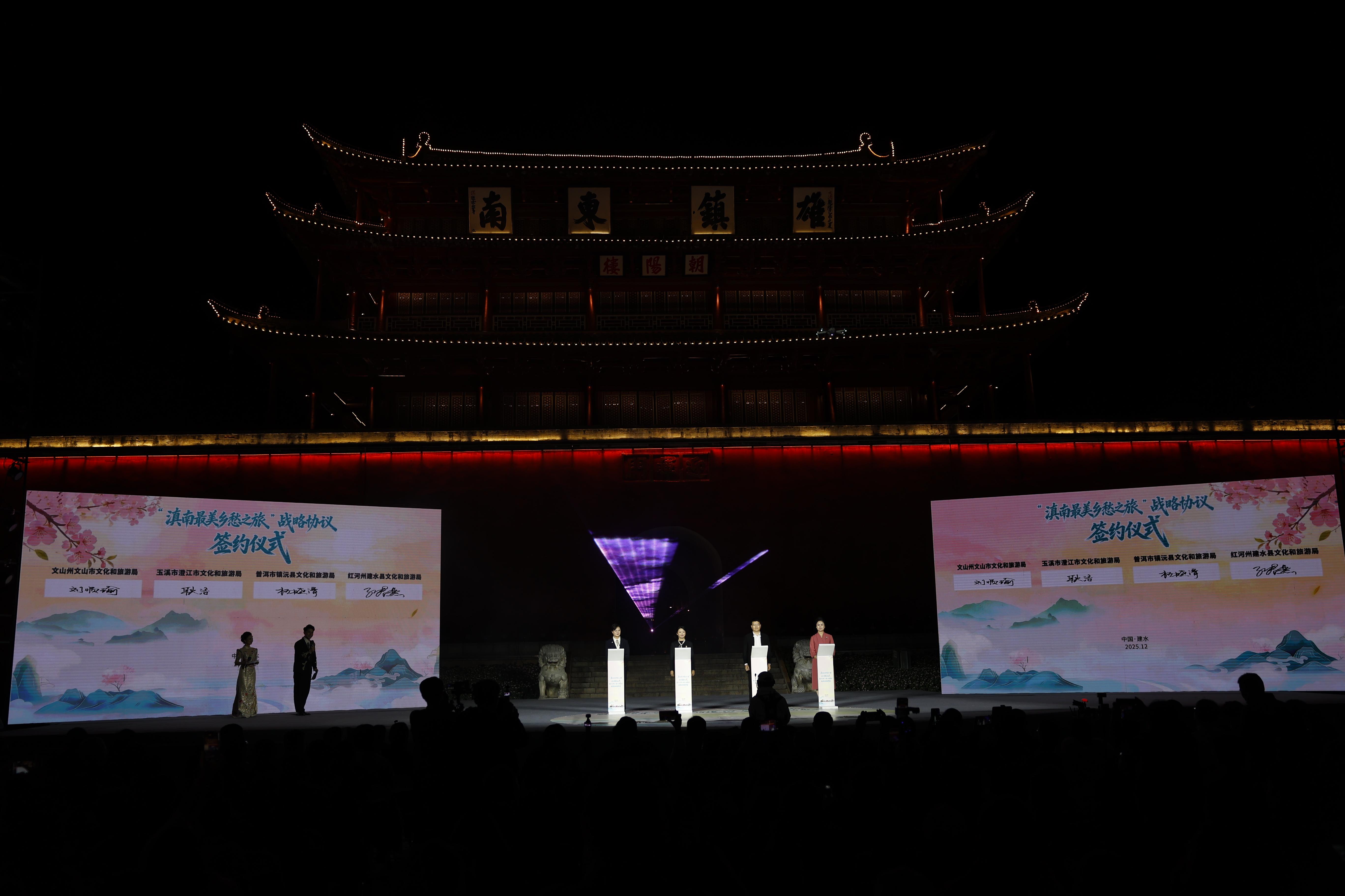 云南省红河哈尼族彝族自治州建水县、玉溪市下辖的澄江市、文山壮族苗族自治州文山市、普洱市镇沅县12月21日晚在建水古城签订滇南最美乡愁之旅战略合作协议,四地将共同打造跨区域文旅品牌。