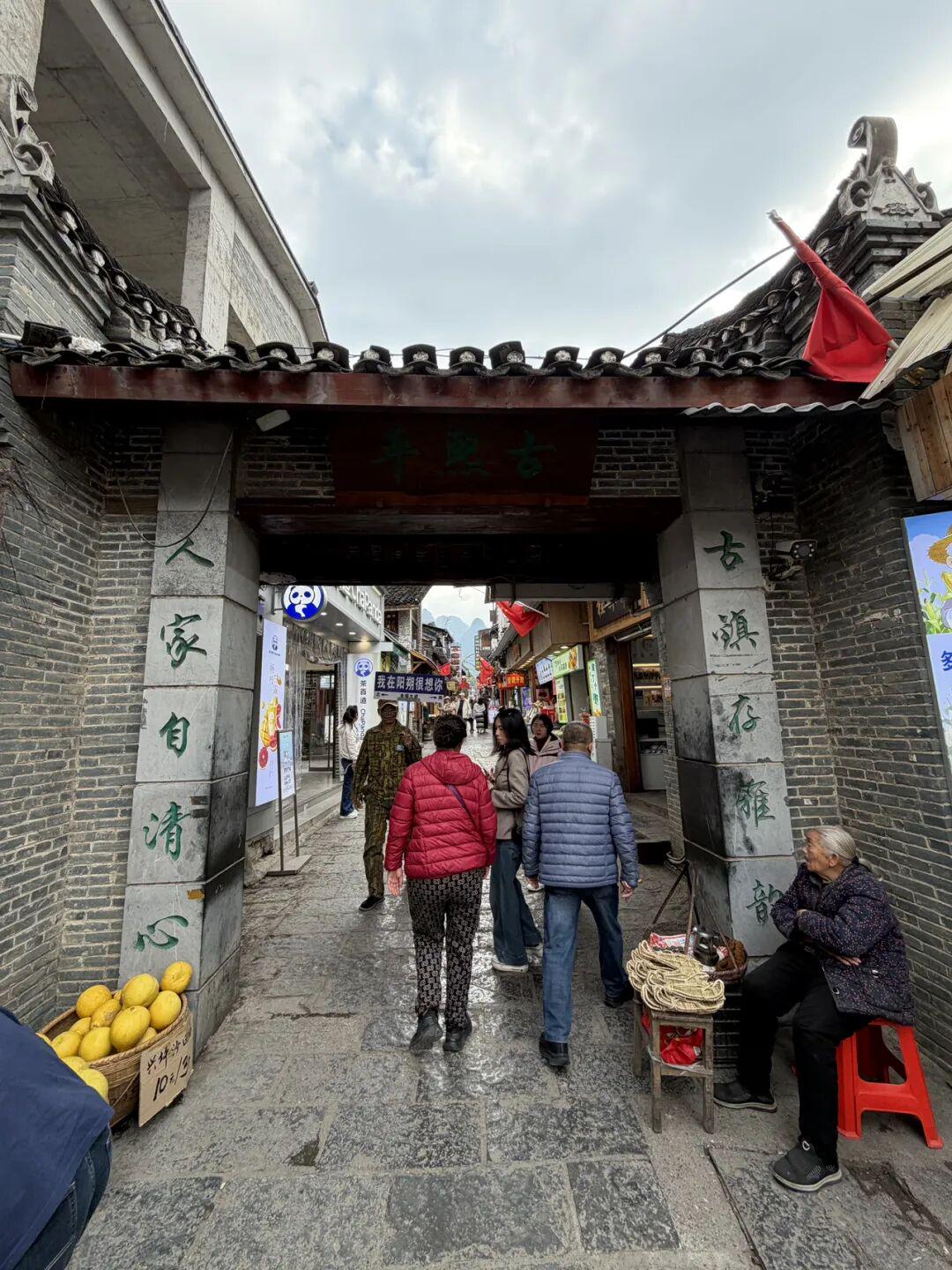 竹筏抵达兴坪码头后,步行10分钟即可进入兴坪古镇。这座拥有千年历史的古镇,冬季少了商业化的喧嚣,青石板路上游客寥寥,明代腾蛟庵、古戏台静静矗立,老茶馆里飘出桂花茶的清香。可以在江边找一家临窗小店,点一壶本地桂花茶,看着江水缓缓流淌,享受难得的静谧;也可以逛逛古镇的手工艺品店,挑选漓江石画、手工姜糖等特色纪念品。