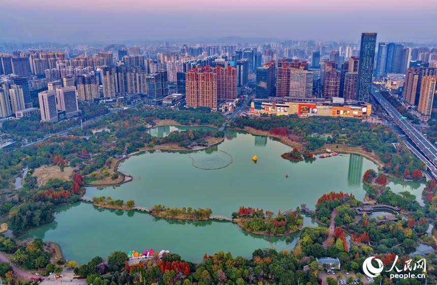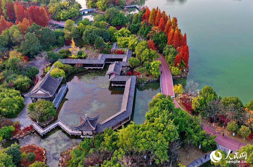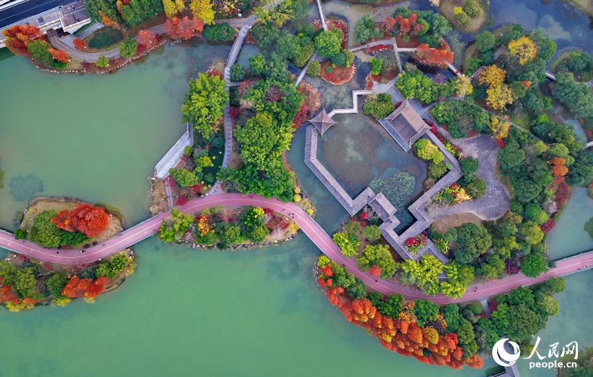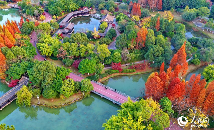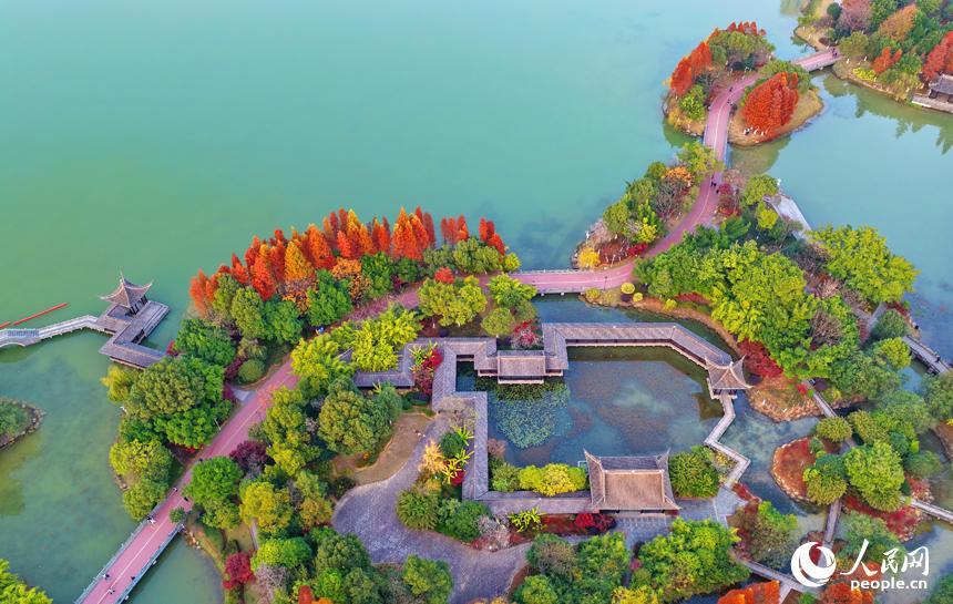 人民网赣州12月22日电 (记者朱海鹏)近日,江西省赣州市中心城区的一处湿地公园,树木色彩斑斓,美不胜收,吸引众多市民前来观赏游玩。