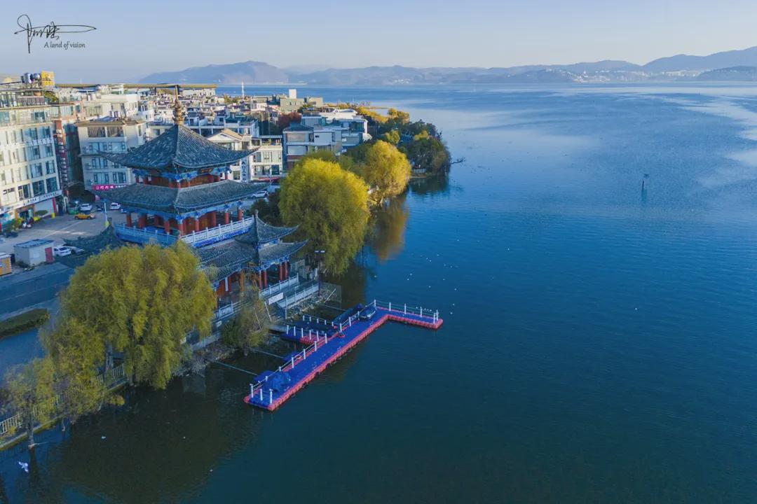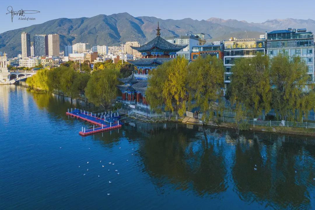 现在的锁水阁实为三层仿古阁式建筑,坐北朝南,东临洱海,西靠苍山(微微有点远),下临西洱河,周边已经被打造成一个极具大理特色的休闲广场。目测阁下岸边还设立了一个规模不大的码头,两侧又有景观绿道一直延伸出去,