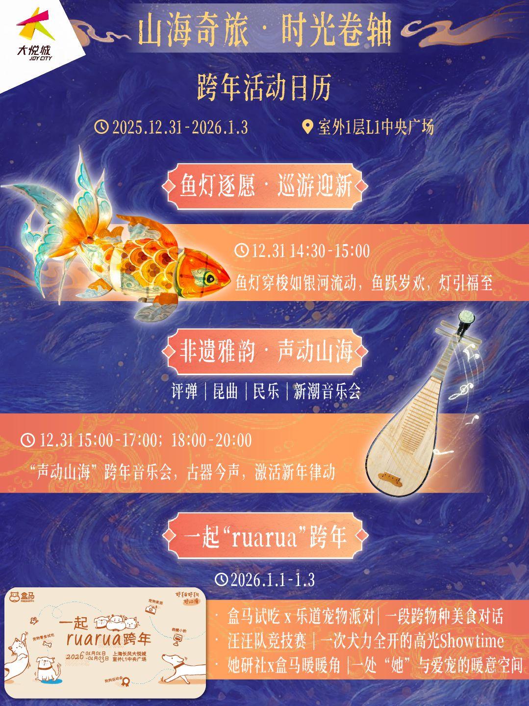 不仅如此,长风大悦城首届《山海经》主题灯会跨年专场“山海系愿·青鸾引新岁”即将启幕:12月31日跨年当天,“声动山海”跨年音乐会携苏州评弹、昆曲雅韵与新潮音乐会将轮番登场,以国潮音律点燃仪式之夜,届时以《山海经》中青鸾鸟为原型打造的主题美陈将惊艳亮相,青鸾振翅、云羽流光,开启沉浸式神话图景;而在新年前三日,盒马鲜生还将携手乐道共同打造“一起ruarua跨年”宠物友好市集,开启宠物派对、汪汪竞技赛与她研社暖暖角等温馨互动,而其二楼的乐高探索中心自2025年12月29日至2026年1月4日推出原价215元直降149元特惠票,打造亲子积木乐园。