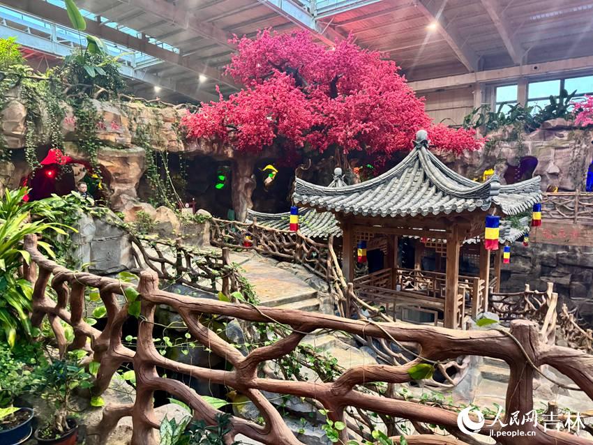 这正是琵岩山温泉古村落着力打造的沉浸式体验。在户外温泉池中,游客可置身42℃的暖泉,抬眼便是近在咫尺的冰瀑壮景。景区还设有朝鲜族服饰免费体验区,近百套传统服饰供游客穿戴留念;每日下午,非遗舞狮、朝鲜族歌舞等演出如期上演,让传统文化的活力在冰雪世界中生动绽放。