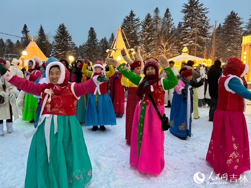 身着朝鲜族服饰的表演者踏雪起舞。人民网记者 李思玥摄