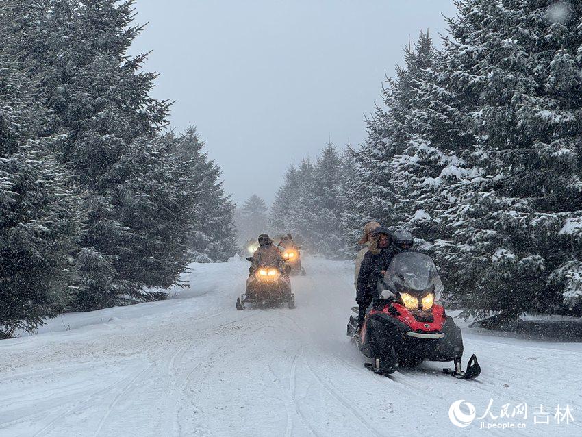 在长白山雪岭景区,游客乘坐雪地摩托驰骋林间。人民网记者 李思玥摄