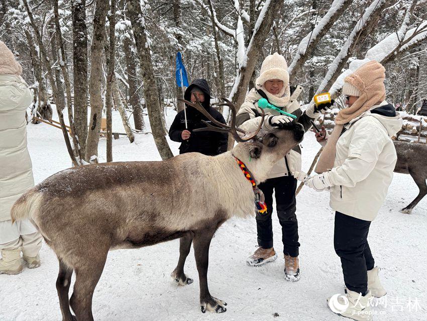 相距不远的老里克湖景区,则呈现出另一重冰雪意境。在这里,冰雪远不止于观赏——游客可以手握苔藓喂食驯鹿,感受雪地摩托在林间驰骋,或是乘马拉爬犁静静穿行于雪原。雪屋火锅热气蒸腾,三角木屋前笑语不断,身着朝鲜族服饰的表演者踏雪起舞,清脆的铃铛声与蒸腾的烟火气交织,共同勾勒出东北冬日那份特有的热烈与诗意。