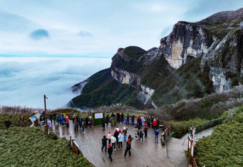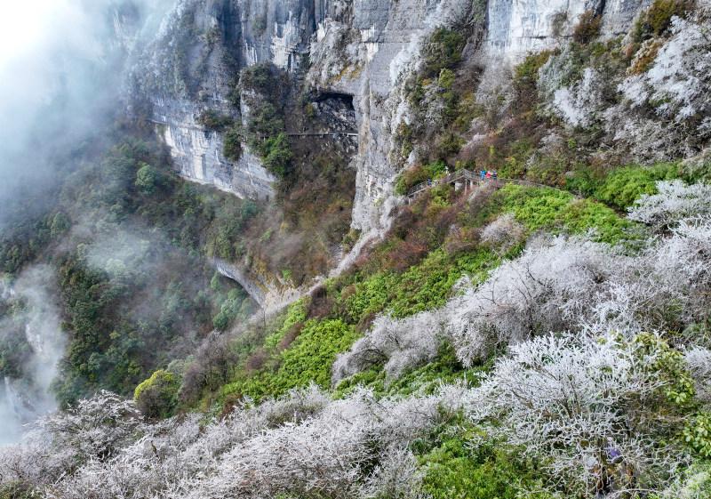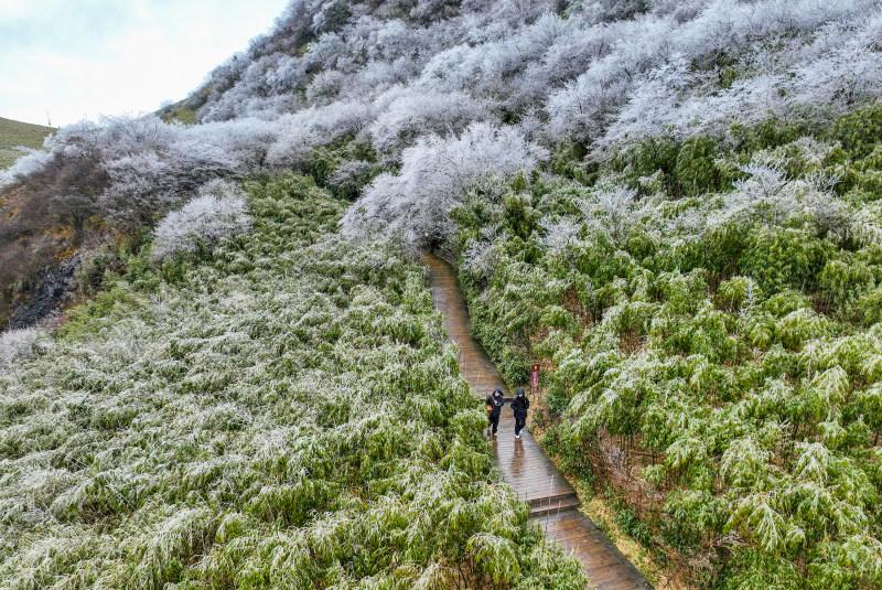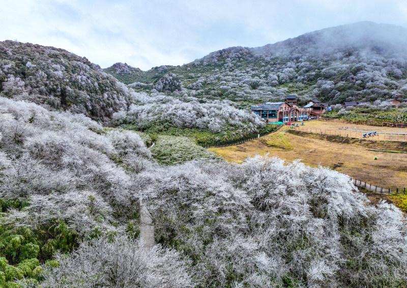 12月23日,受寒潮影响,重庆南川金佛山景区出现雾凇云海景观。漫山晶莹的雾凇宛若花开,吸引众多游人前来观赏。金佛山海拔超过2000米,是重庆冬季观赏冰雪景观的理想目的地。