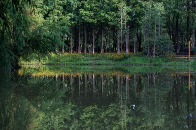 碧波荡漾、森林环抱