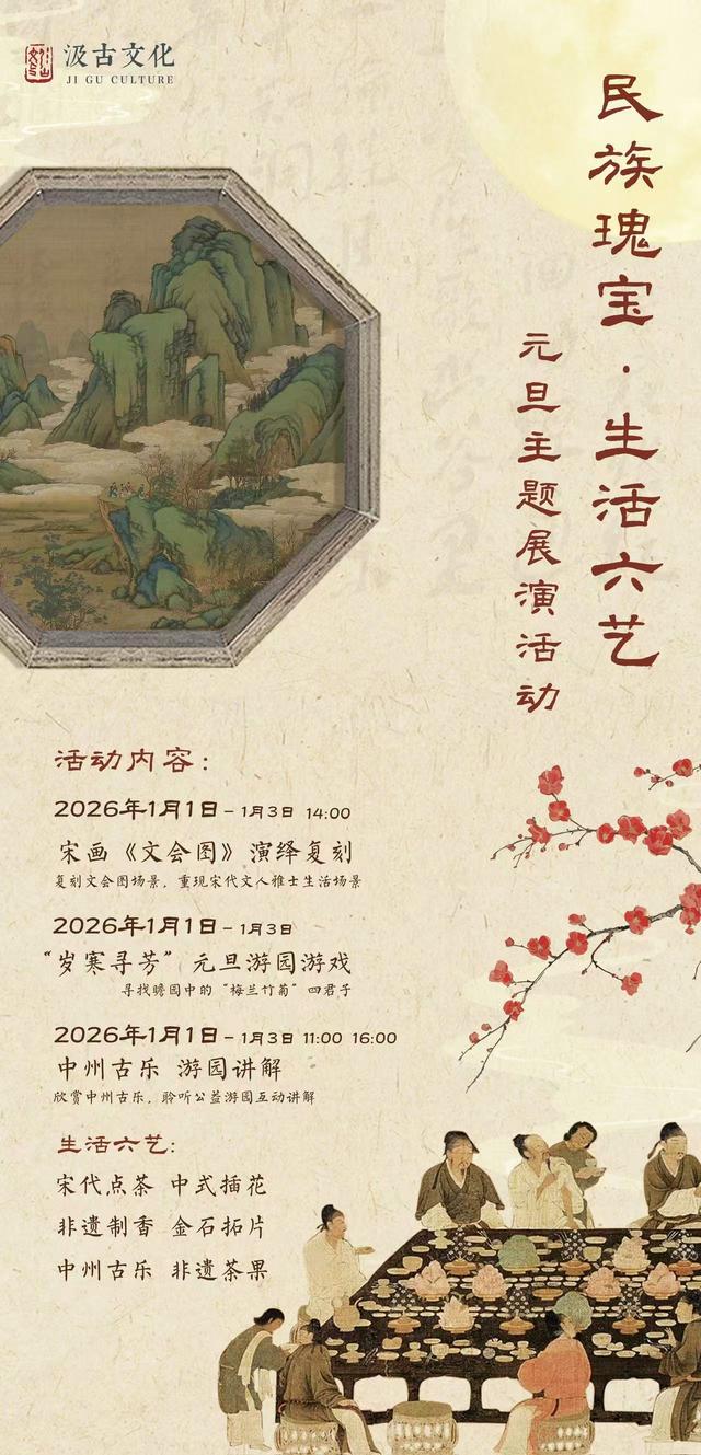 元旦的樱桃沟瞻园有着最雅致的跨年仪式,宋画《文会图》情景再现,人文花道、非遗制香、宋代点茶、中州古乐、金石拓片、非遗茶果子等传统文化展演邀你沉浸式感受“唐宋雅韵”。1月1日-3日,持“寻芳谱”寻找园区内“梅兰竹菊”4名君子NPC对诗答题互动,集齐印章可获得活动好礼,另外每天新增三场专业文化讲解,带领游客深度了解古建文化。