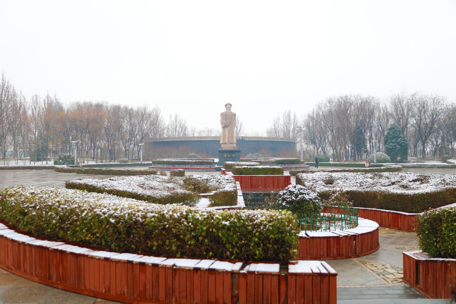 降雪过后,香涛公园内的冬青与张之洞雕像相伴。赵华靖摄
