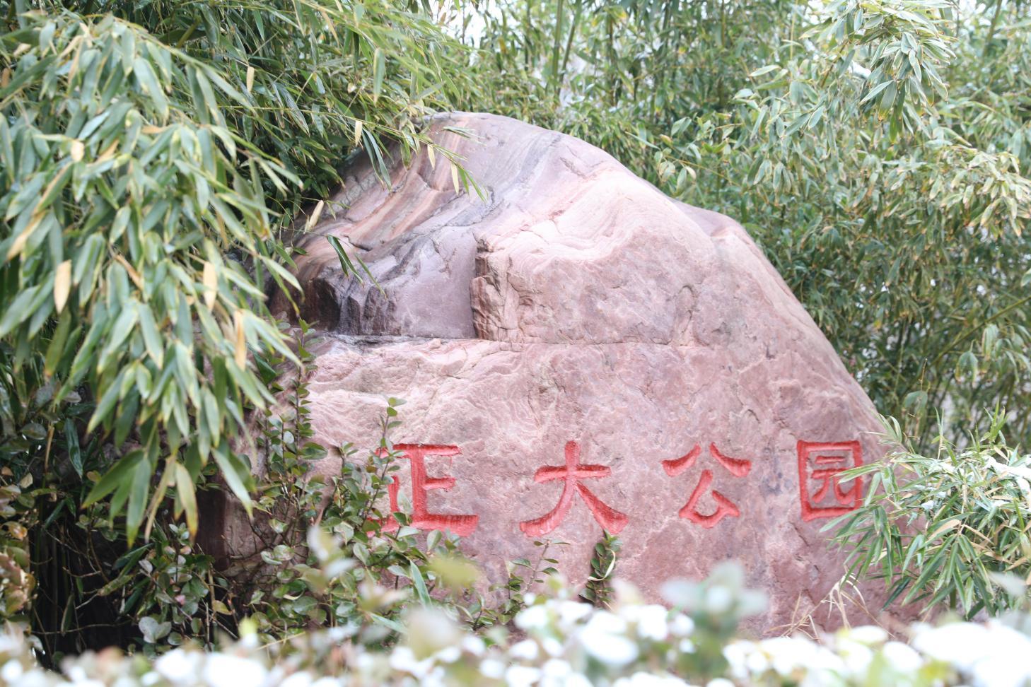 掩映在常绿植物中的正大公园石碑。赵华靖摄