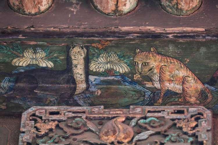 “猫蝶”与“耄耋”谐音,所以常一同出现在砖雕壁画之中,取长寿之意,我们在游览古建筑时常遇到猫咪,增添一份独特乐趣。
