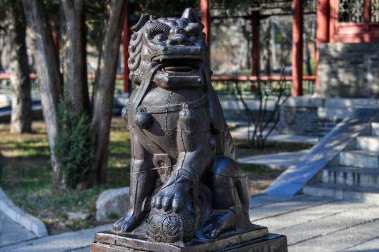 狮子随佛教东传,被奉为护法神兽,代表智慧与威严。文殊菩萨的坐骑即为青狮,象征智慧的勇猛与无畏。寺院山门前常设狮子,护持佛法。