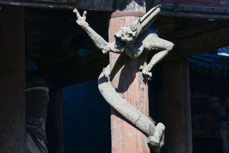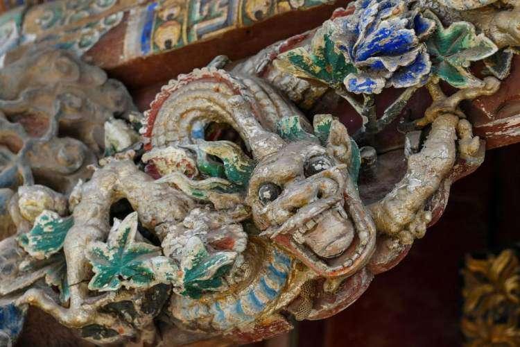 龙是神话故事中呼风唤雨的神灵,具有镇邪驱恶、守护殿宇的寓意。同时龙代表着至高无上的权力与尊贵。龙身盘曲而上,充满动感与力量,象征着生命律动与宇宙能量,为庄严肃穆的祠庙建筑注入灵动与生机。