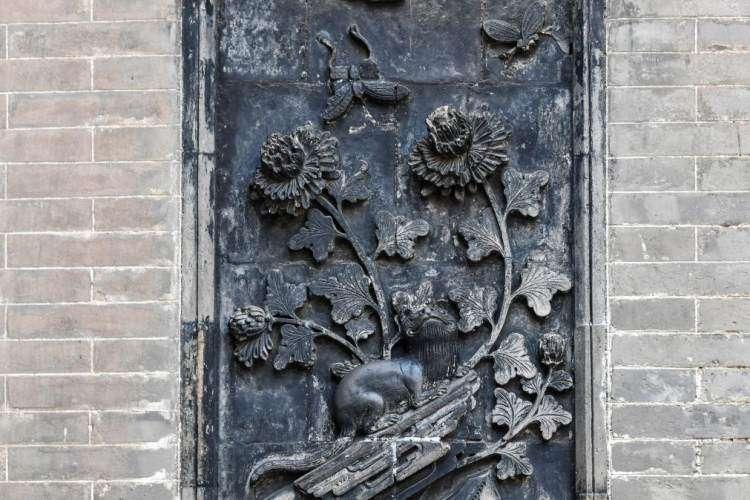 这是12月11日在山西省祁县乔家大院拍摄的以猫与蝶为主题的砖雕。