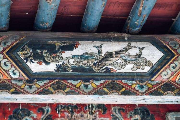 鱼亦承载着对仕途的期许。“鱼跃龙门”的传说,让它成为科举中第、人生飞跃的象征,激励着古往今来的学子。鱼在木构建筑中还扮演着“守护者”的角色。古人深信“水能克火”,在梁枋等关键部位绘上鱼纹,是一种传统的“厌胜”防火之术,与屋脊上镇火的鸱吻神兽遥相呼应,共同守护着这座千年古建的平安。
