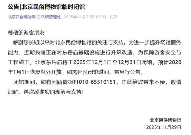 北京民俗博物馆东岳庙于2025年12月1日至12月31日闭馆,预计2026年1月1日恢复对外开放,如需延长闭馆时间,将另行公告。