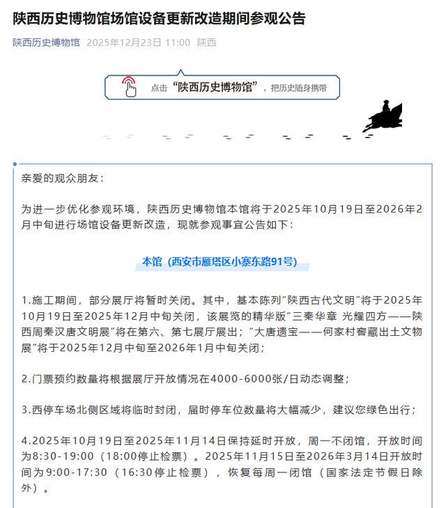 陕西历史博物馆本馆将于2025年10月19日至2026年2月中旬进行场馆设备更新改造,期间部分展厅将暂时关闭。同时,陕西历史博物馆本馆“唐代壁画珍品展”以及“壁上丹青 盛唐气象——唐韩休墓壁画考古发掘与保护展”将于2025年11月3日起暂时关闭,恢复开放时间将另行公告。