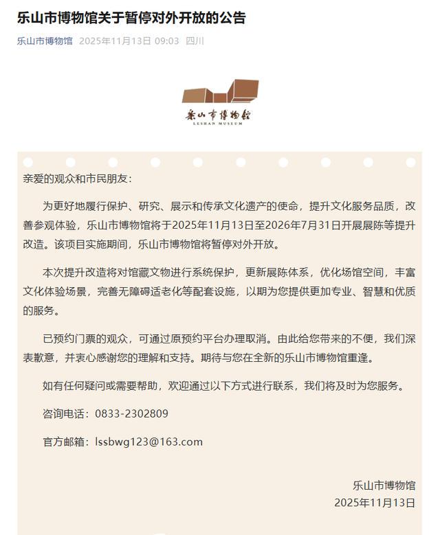 乐山市博物馆于2025年11月13日至2026年7月31日开展展陈等提升改造,期间将暂停对外开放。
