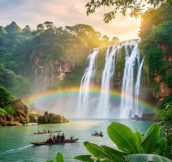 雨后的德天瀑布上空架起彩虹桥。