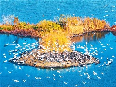 近日,江苏兴化里下河国家湿地公园内候鸟翔集,鸟儿在水面上自由地栖息、觅食。 周社根摄(人民视觉)