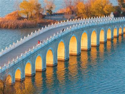 安徽省淮北市烈山区南湖国家湿地公园的十七孔桥近日出现“金光穿洞”景观,吸引众多游客前来观赏。 张 伟摄(人民视觉)