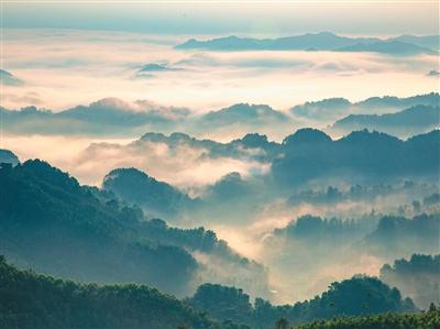 广西壮族自治区贺州市昭平县裕益村,层峦叠嶂的群山沐浴在晨雾之中,一幅壮观恢宏的冬日画卷跃入眼帘。 黄胜林摄(人民视觉)